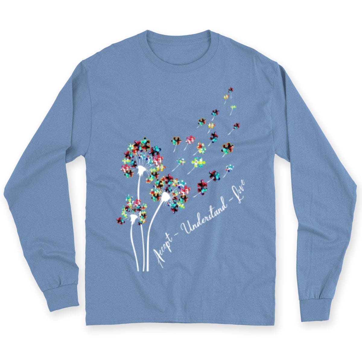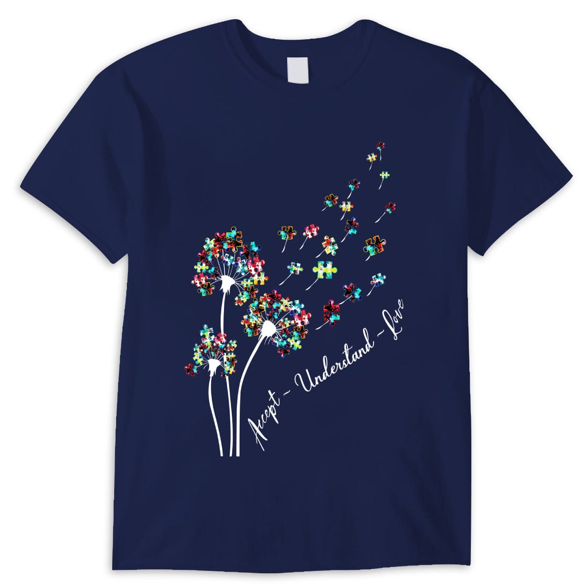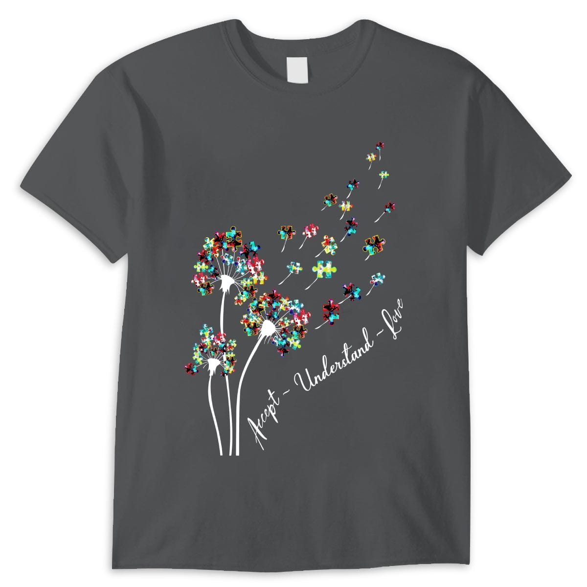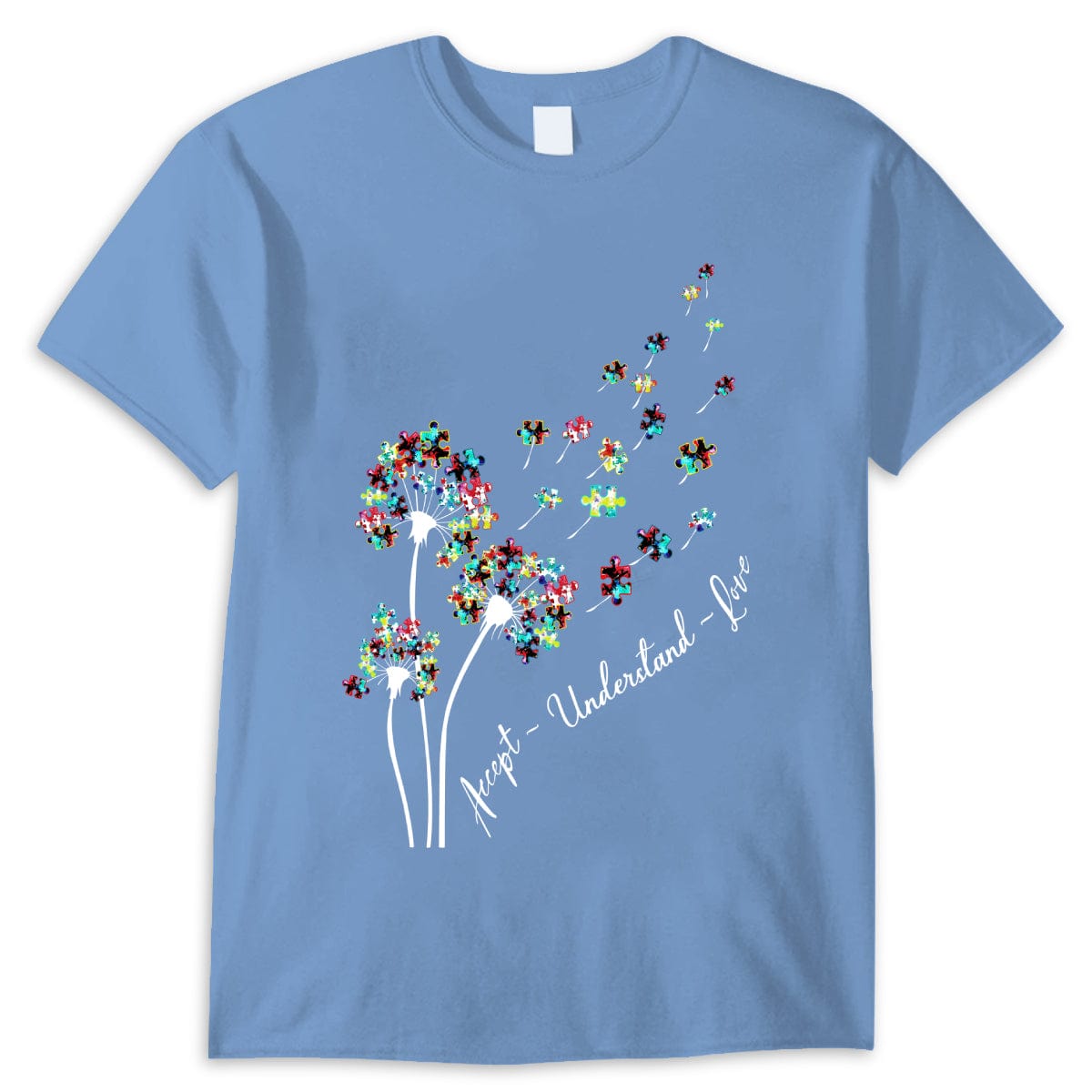 Camiseta de aceptación, comprensión, amor, pieza de rompecabezas, diente de león, conciencia de la aceptación del autismo