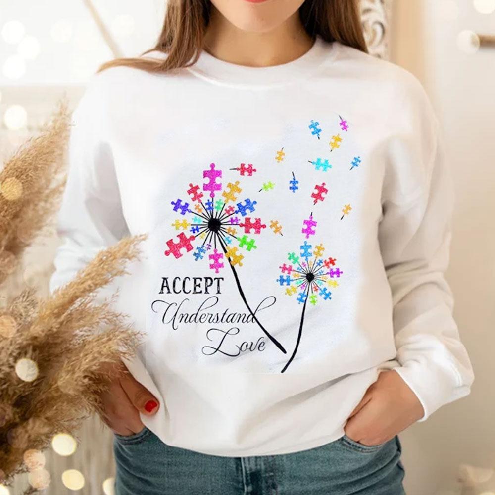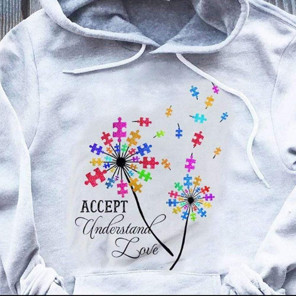 Sudadera con capucha con la frase "Aceptar, comprender, amar", pieza del rompecabezas, diente de león, aceptación del autismo