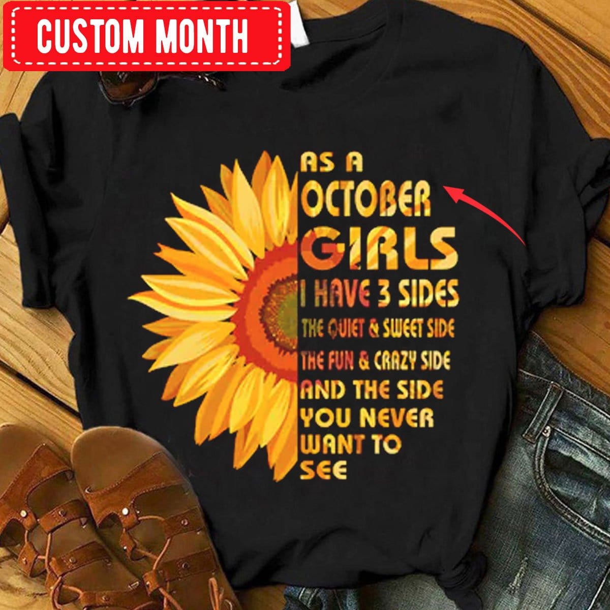 Como chica de octubre, tengo 3 lados: camisetas de cumpleaños personalizadas con girasoles