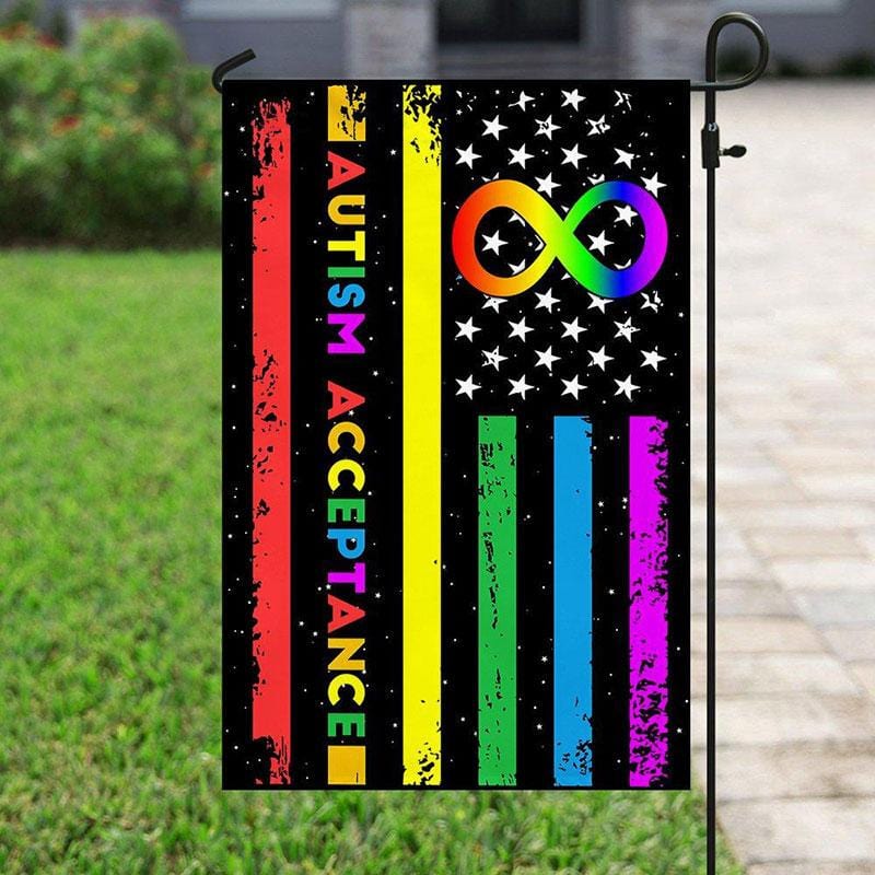Bandera de concienciación sobre el orgullo estadounidense y la aceptación del autismo, con el símbolo del infinito y la estrella, para la casa y el jardín