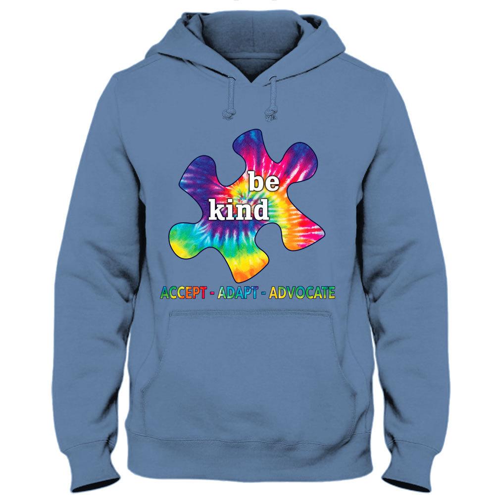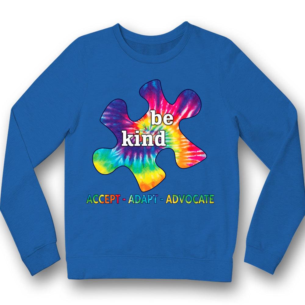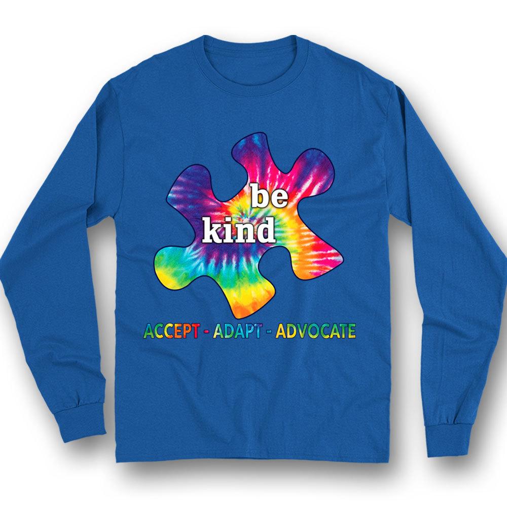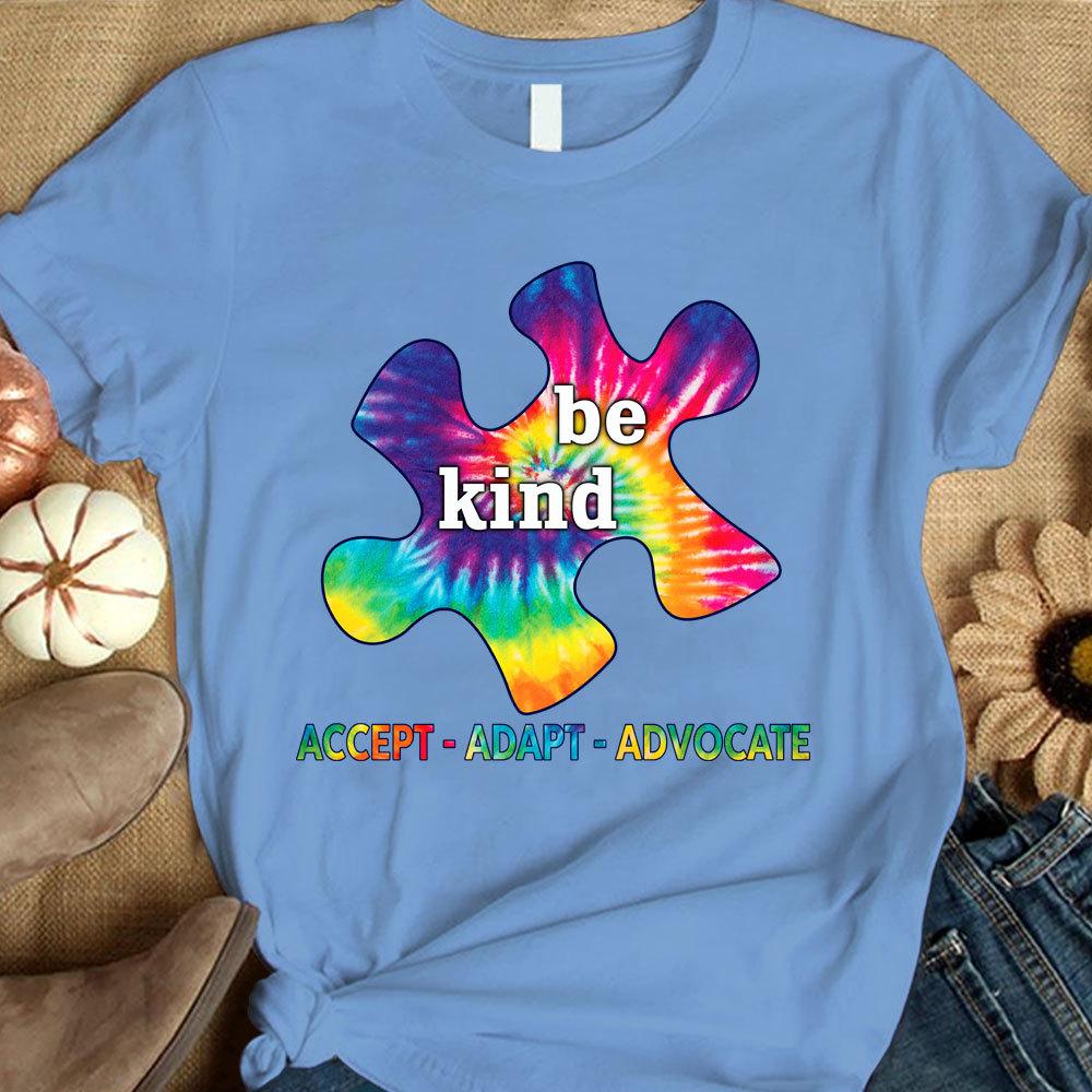 Camiseta de aceptación del autismo Sea amable, adáptese, abogue por las piezas del rompecabezas