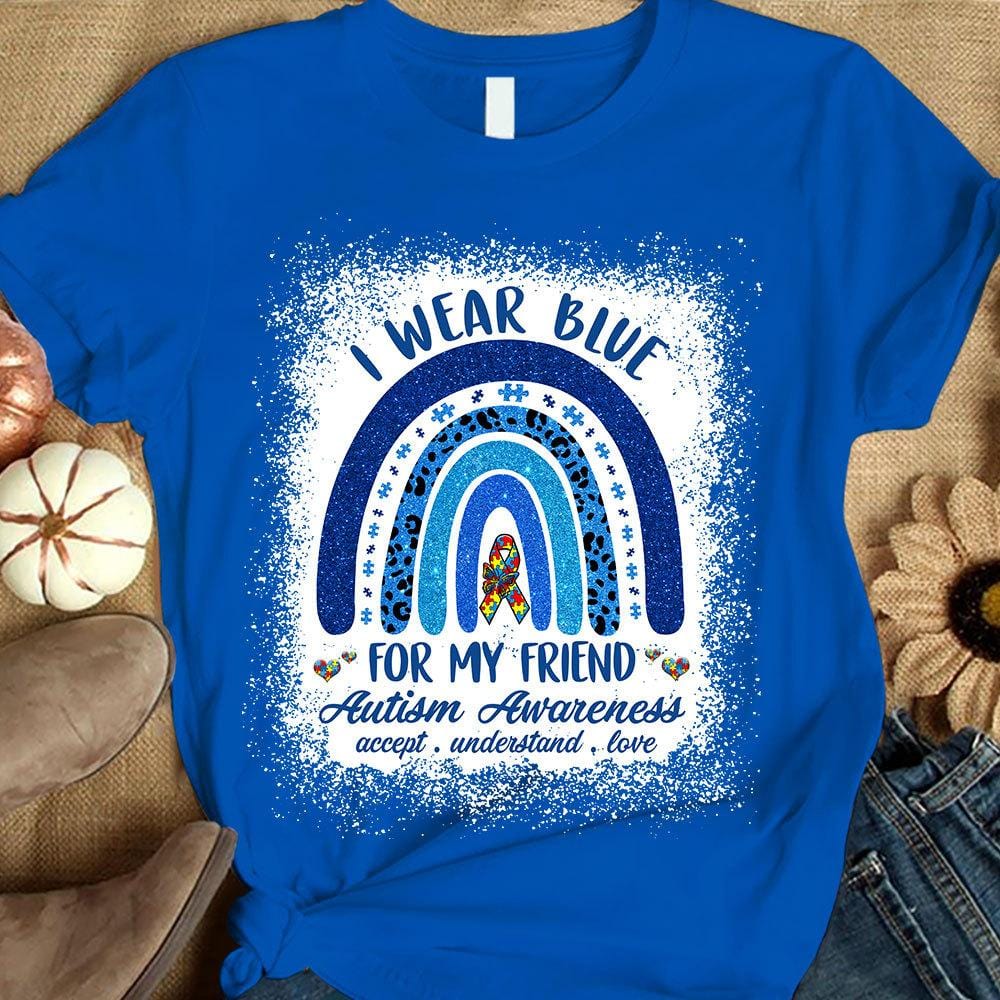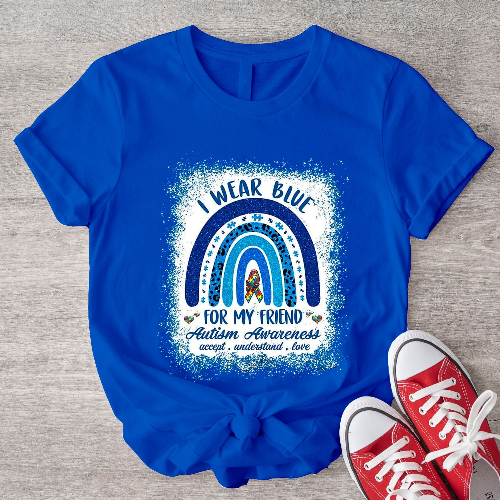 Camiseta de concienciación sobre la aceptación del autismo, "Me pongo azul por un amigo", pieza de rompecabezas de arcoíris