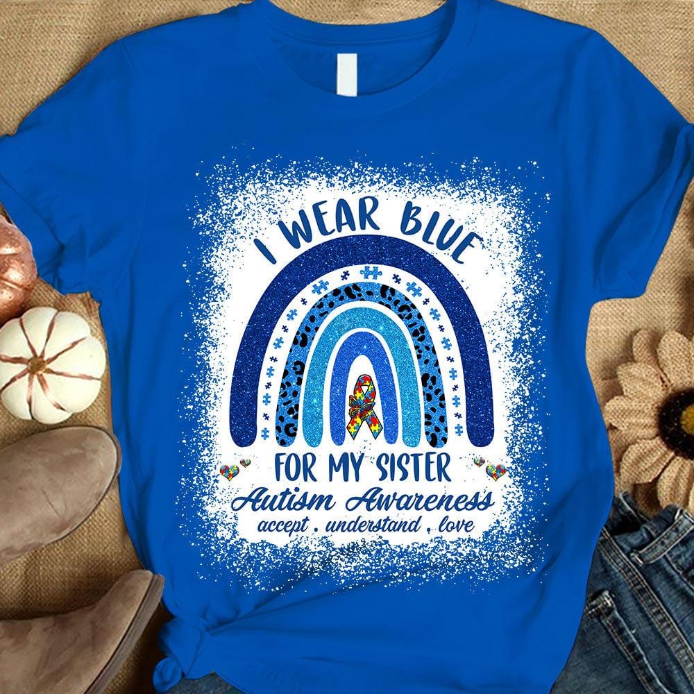 Camiseta de concienciación sobre la aceptación del autismo, "Me pongo azul por mi hermana", pieza de rompecabezas de arcoíris