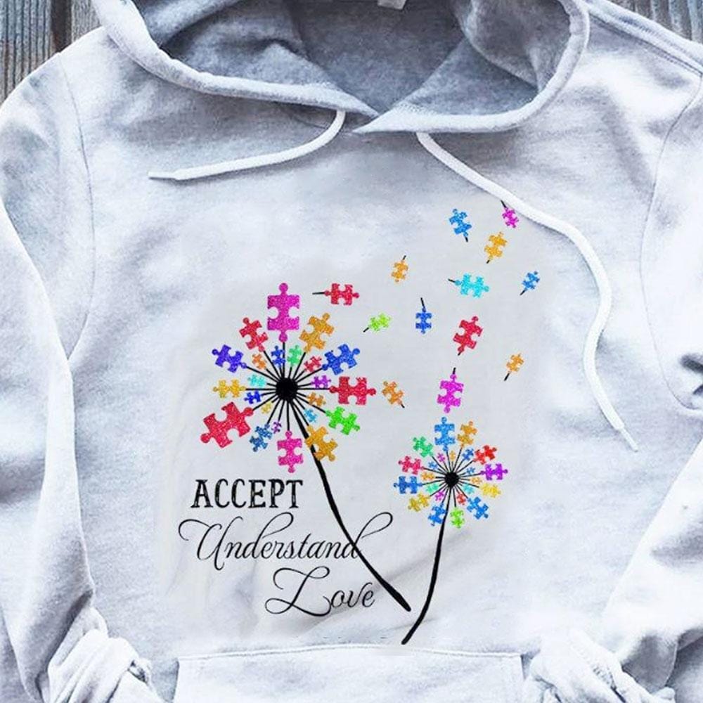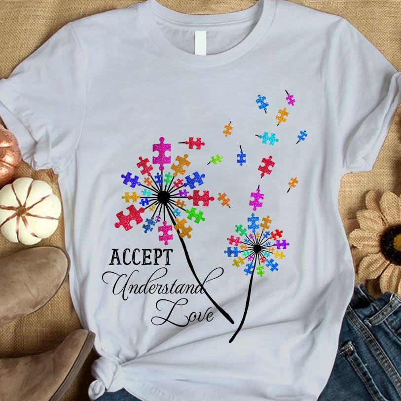 Camiseta de concienciación sobre la aceptación del autismo, aceptar, comprender, amar, pieza de rompecabezas, diente de león