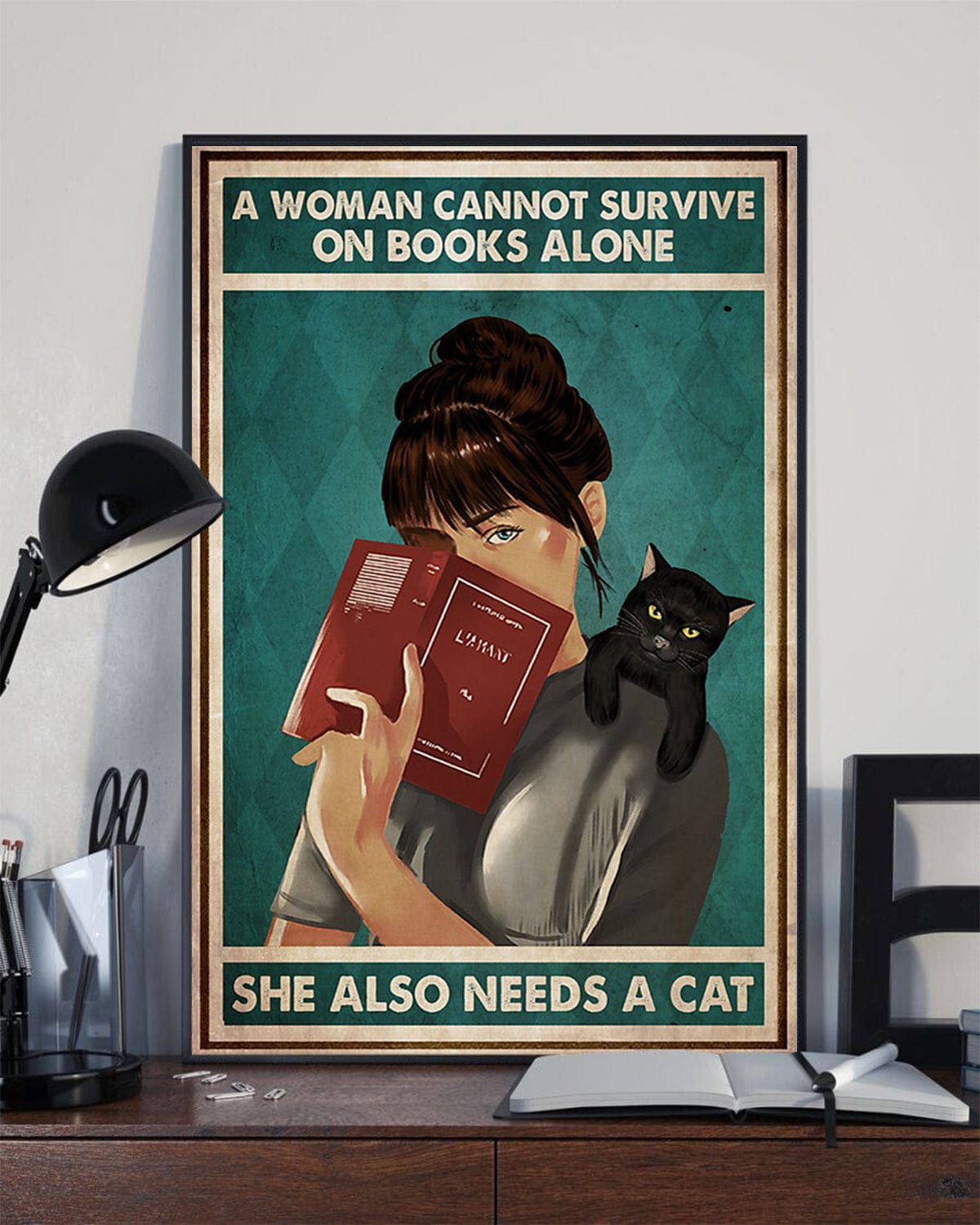 Una mujer no puede sobrevivir solo de libros, también necesita un gato. Póster de gato negro y libro, lienzo