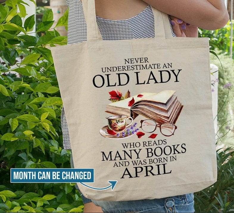 Bolsa de tela personalizada con el mensaje "Nunca subestimes a una anciana que lee muchos libros"
