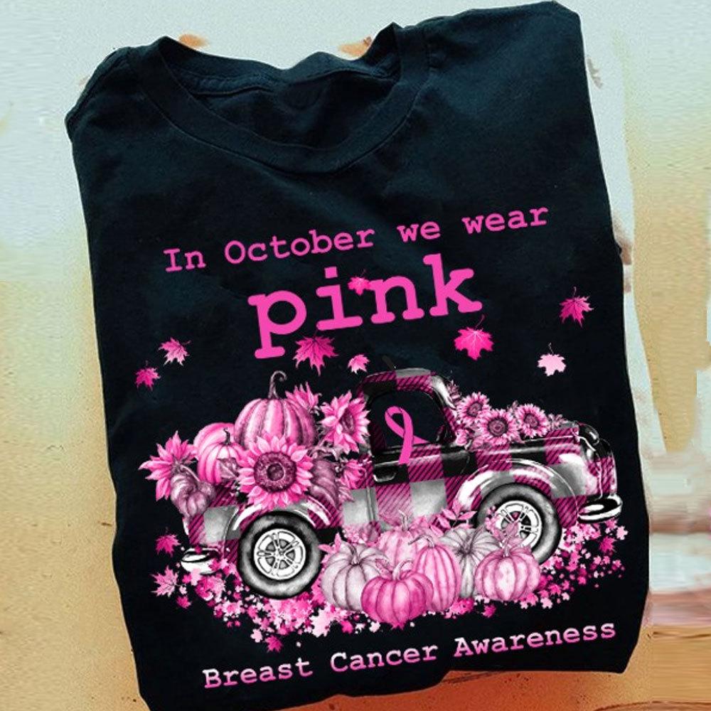 Camisetas contra el cáncer de mama En octubre usamos un coche de calabaza rosa, camisetas del mes de concientización sobre el cáncer de mama