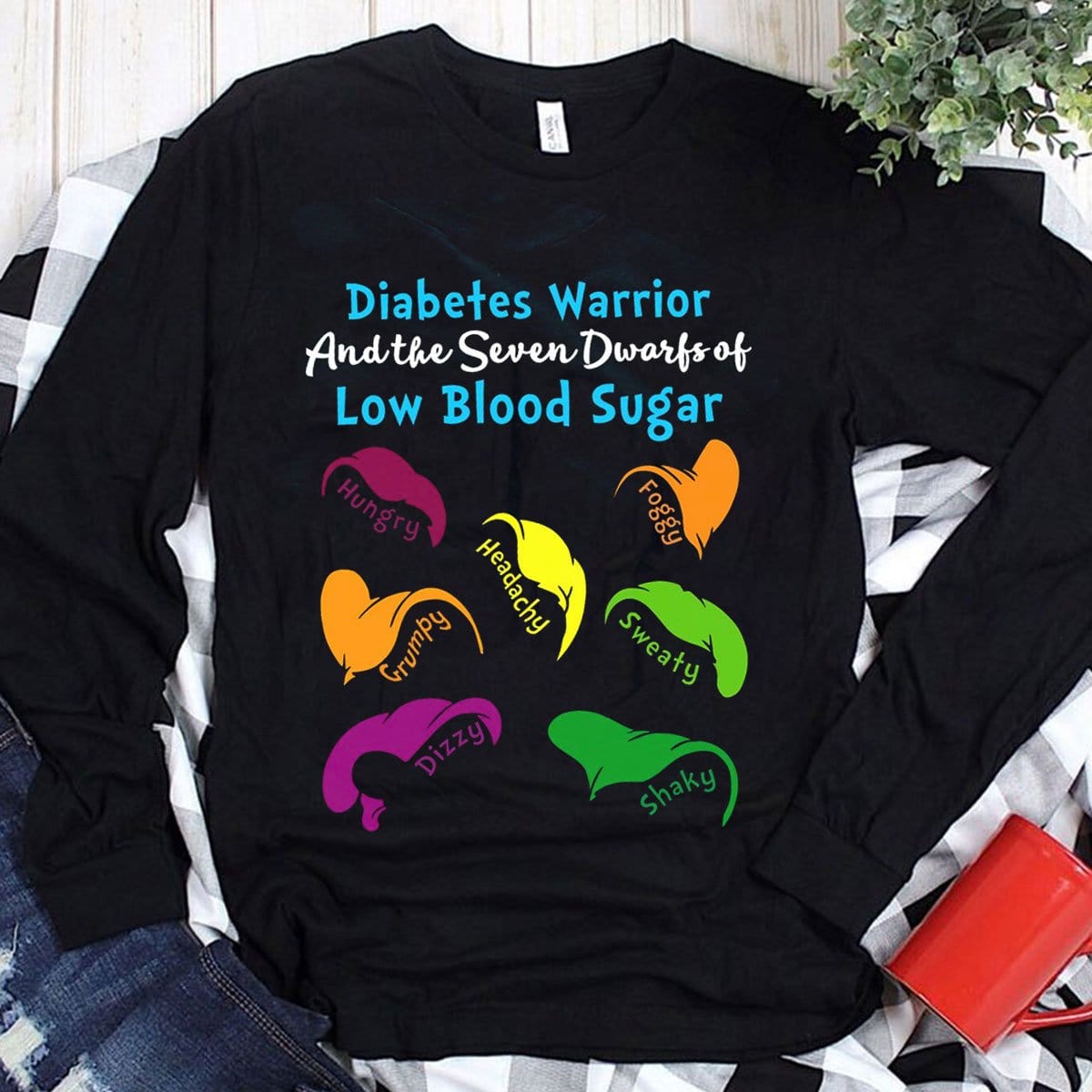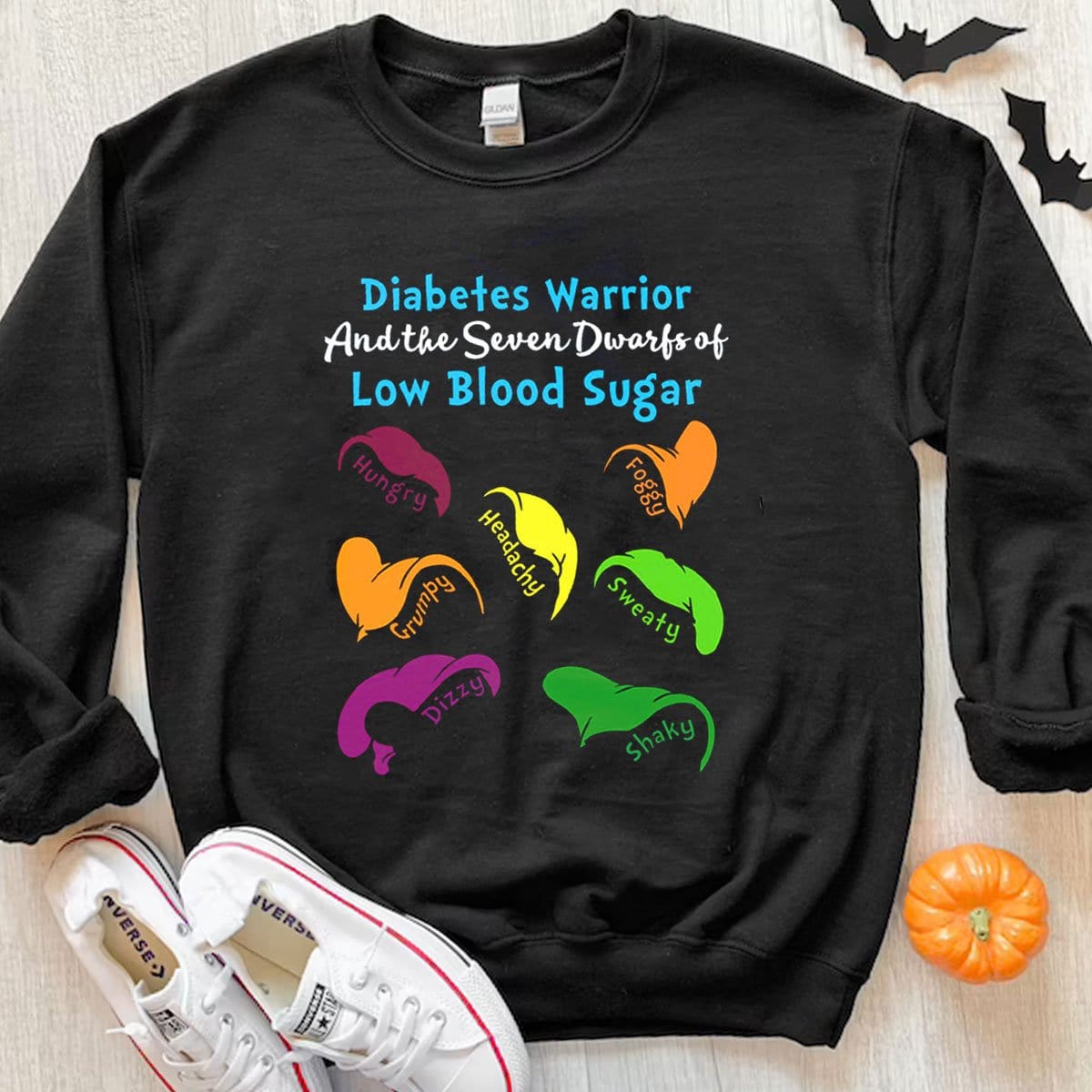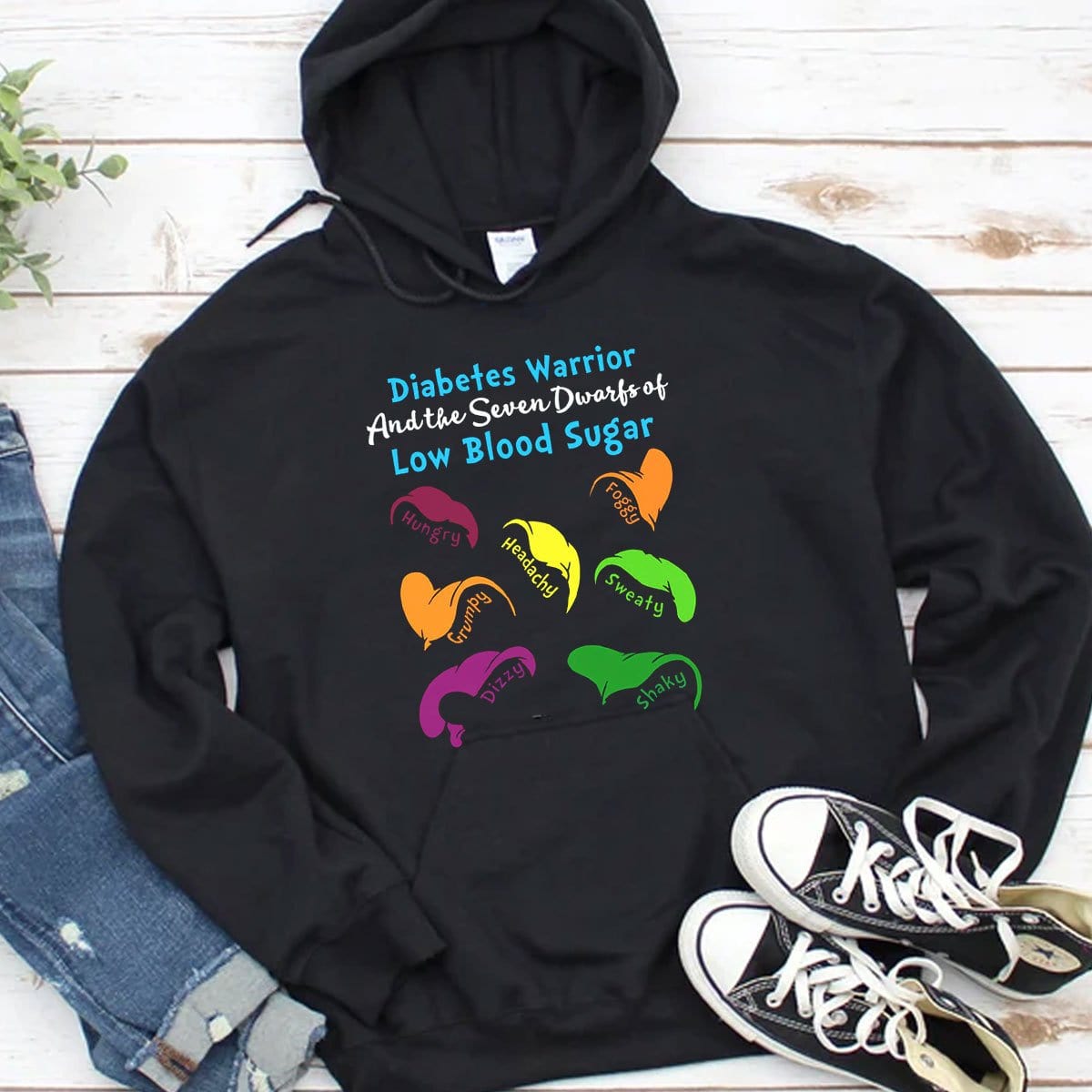 Sudadera con capucha y camisetas de Diabetes Warrior y los siete enanitos de la hipoglucemia