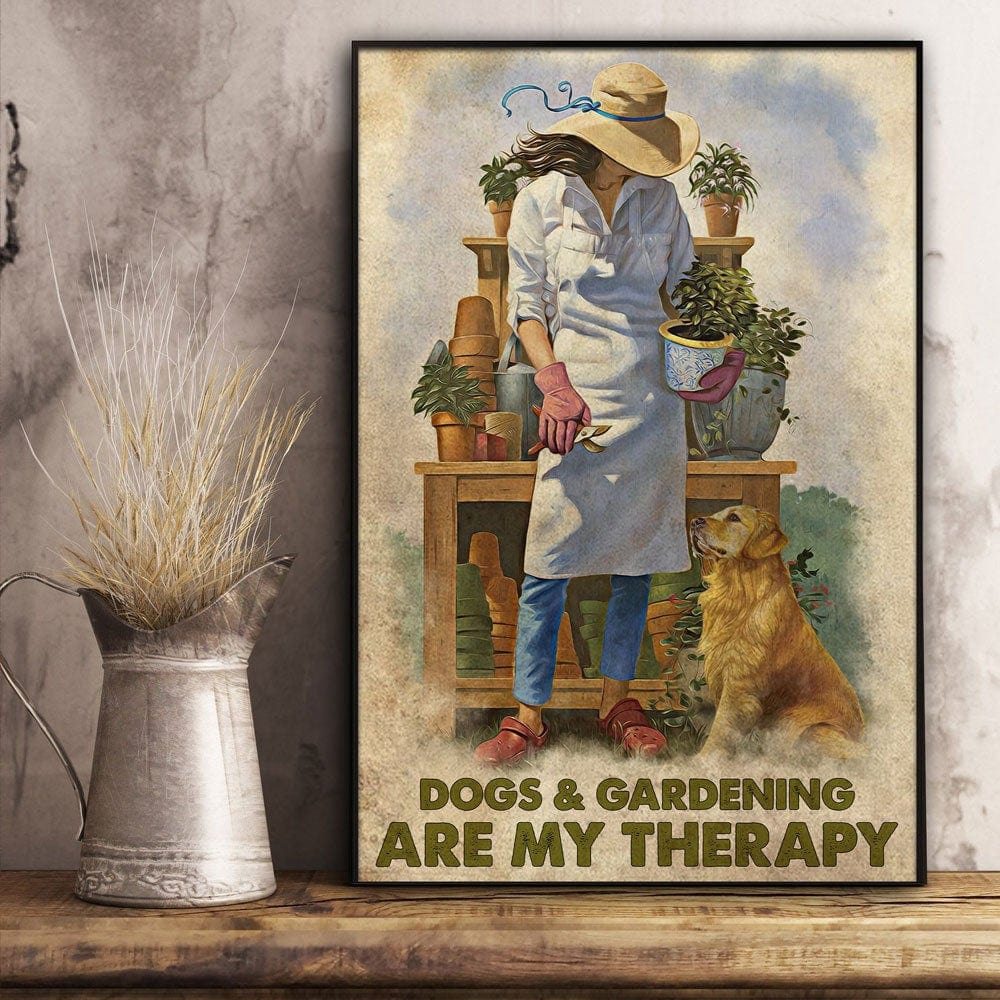 Póster Los perros y la jardinería son mi terapia, lienzo