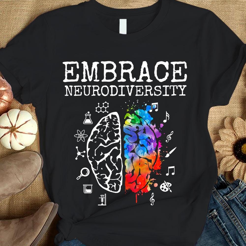 Camiseta con el mensaje "Abraza la neurodiversidad", "Cerebro arcoíris", concienciación sobre el autismo