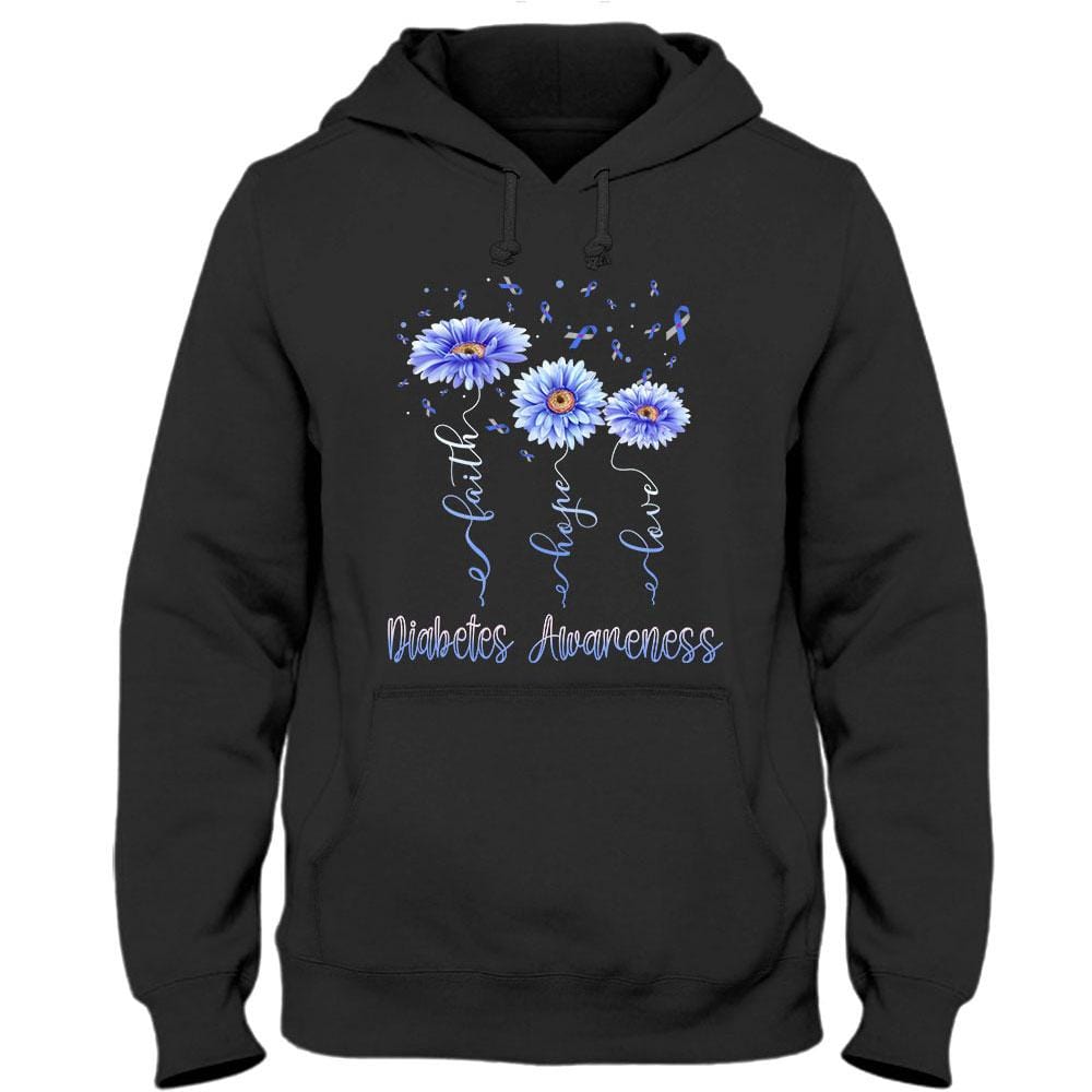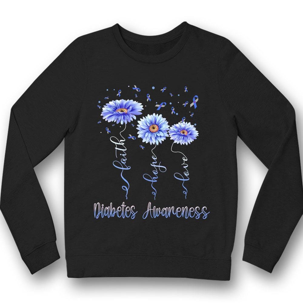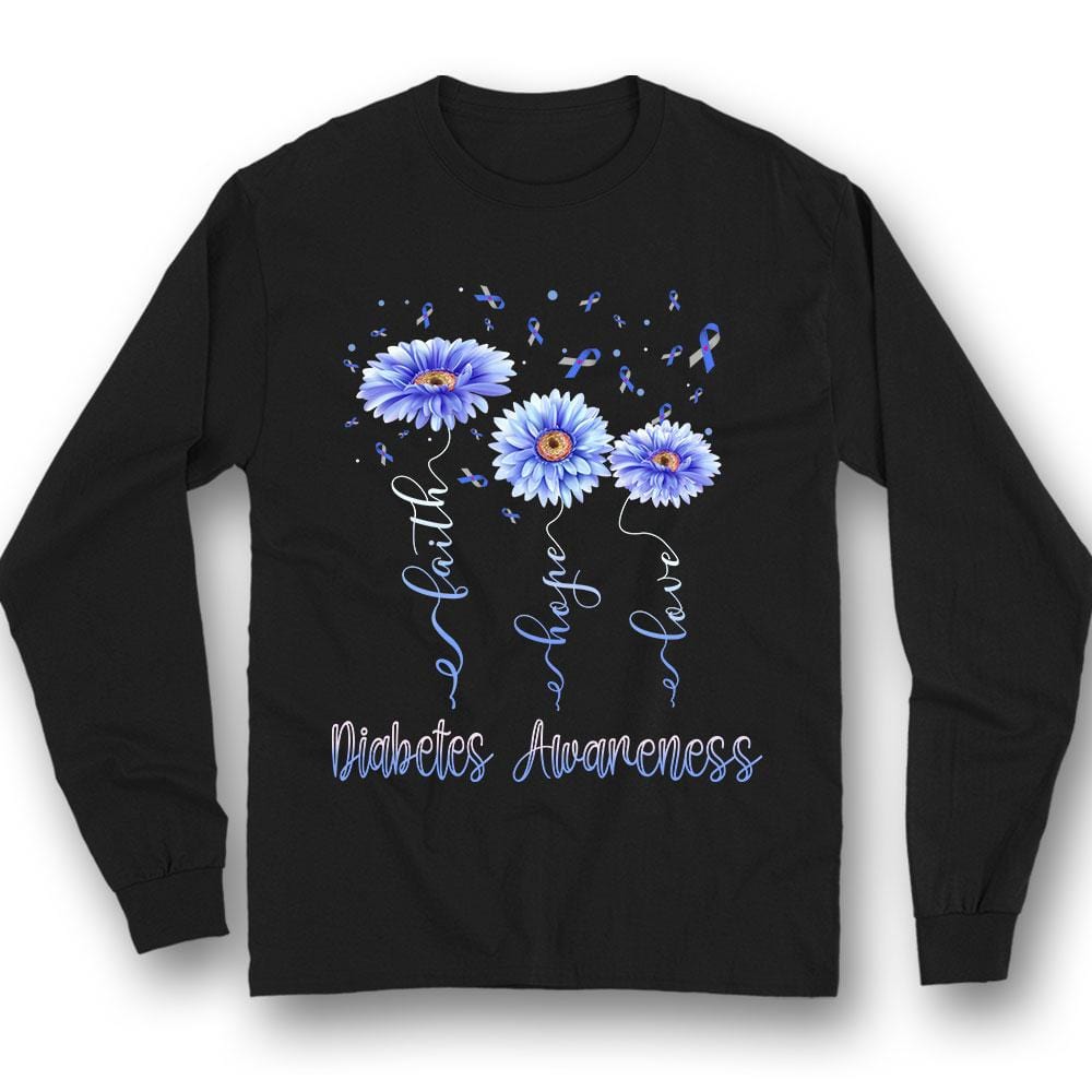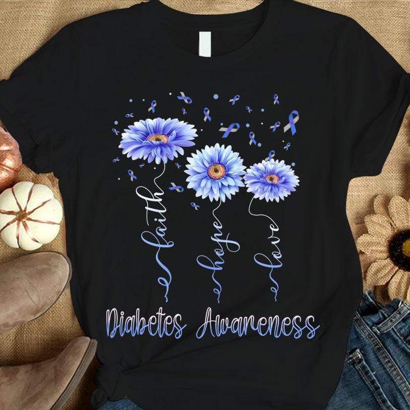 Camiseta de apoyo a la concienciación sobre la diabetes con gerberas, lazos y fe