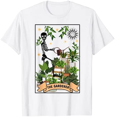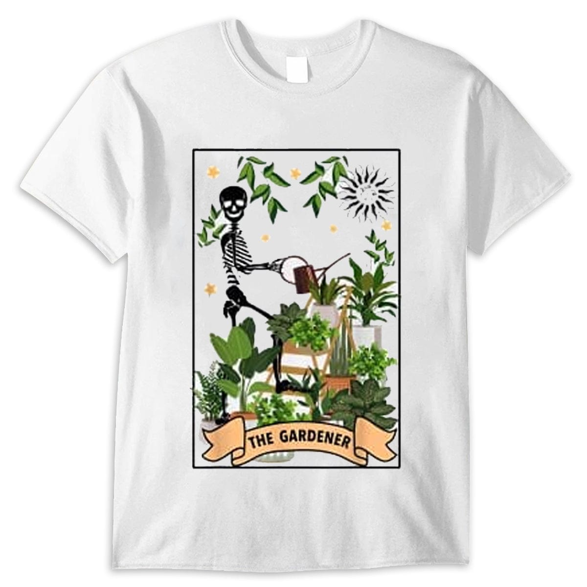 Camiseta de jardinería con esqueleto místico y divertida carta del tarot del jardinero