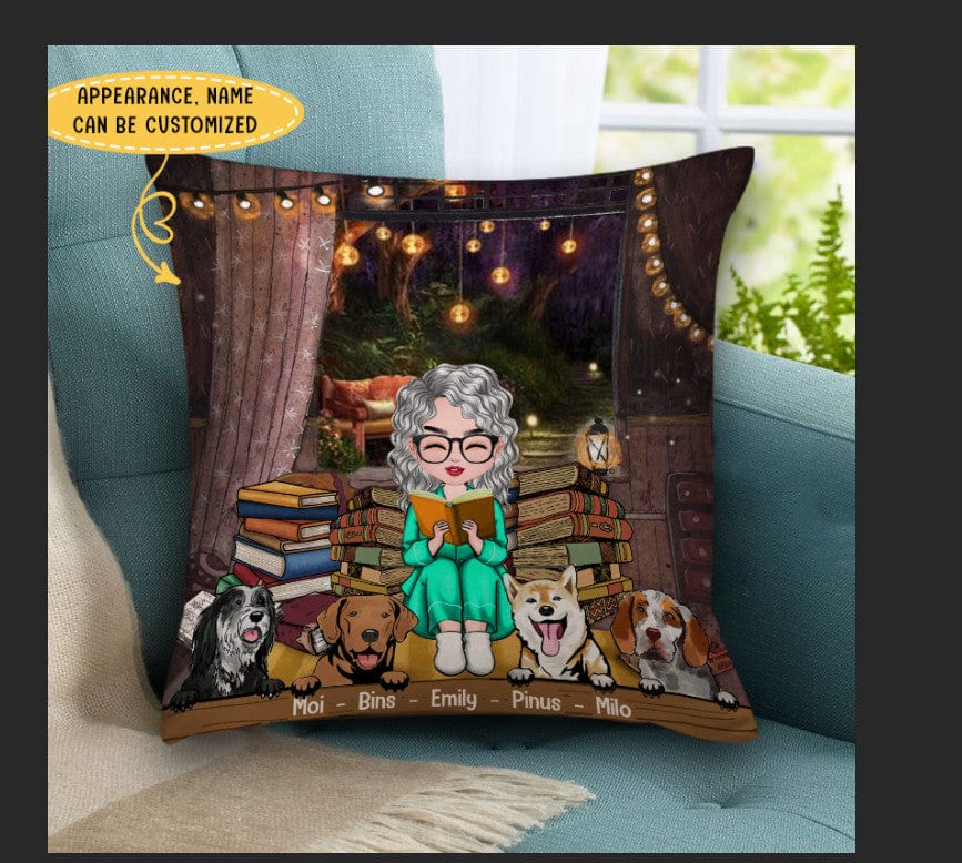 Almohada personalizada con forma de niña leyendo un libro y perros