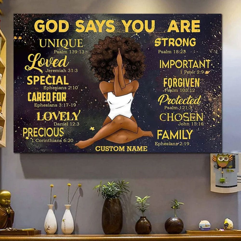 Póster de yoga personalizado de una chica afroamericana y negra, Dios dice que eres tú