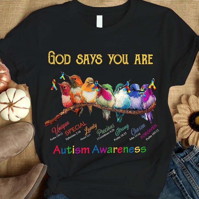 Dios dice que eres única, hermosa, fuerte, con lazo y pájaro, divertida camiseta de concienciación sobre el autismo