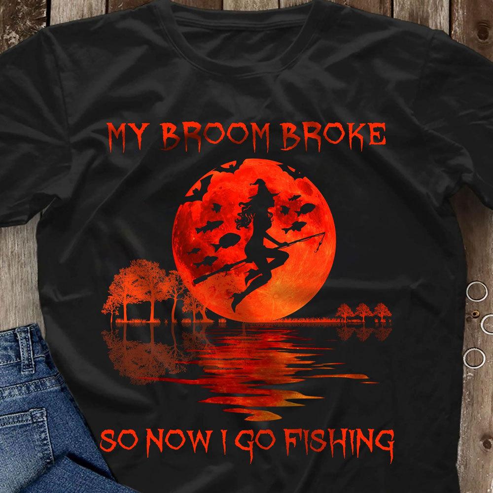 Camisetas divertidas de pesca de Halloween Bruja, mi escoba se rompió, así que ahora voy a pescar