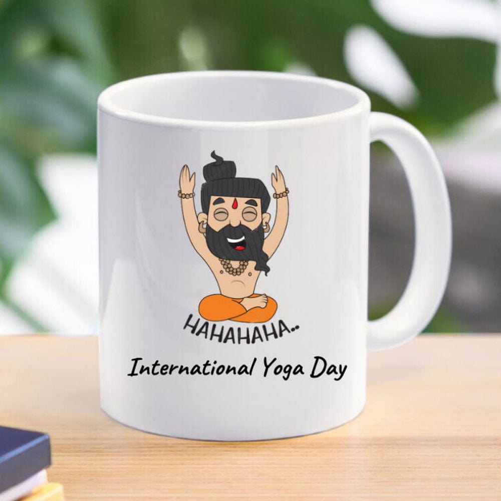 Tazas y platillos con el feliz Día Internacional del Yoga