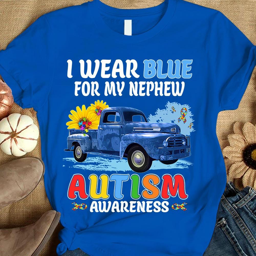 Llevo puesto el azul por mi sobrino, camiseta de concienciación sobre el autismo con un girasol y un coche en forma de pieza de rompecabezas