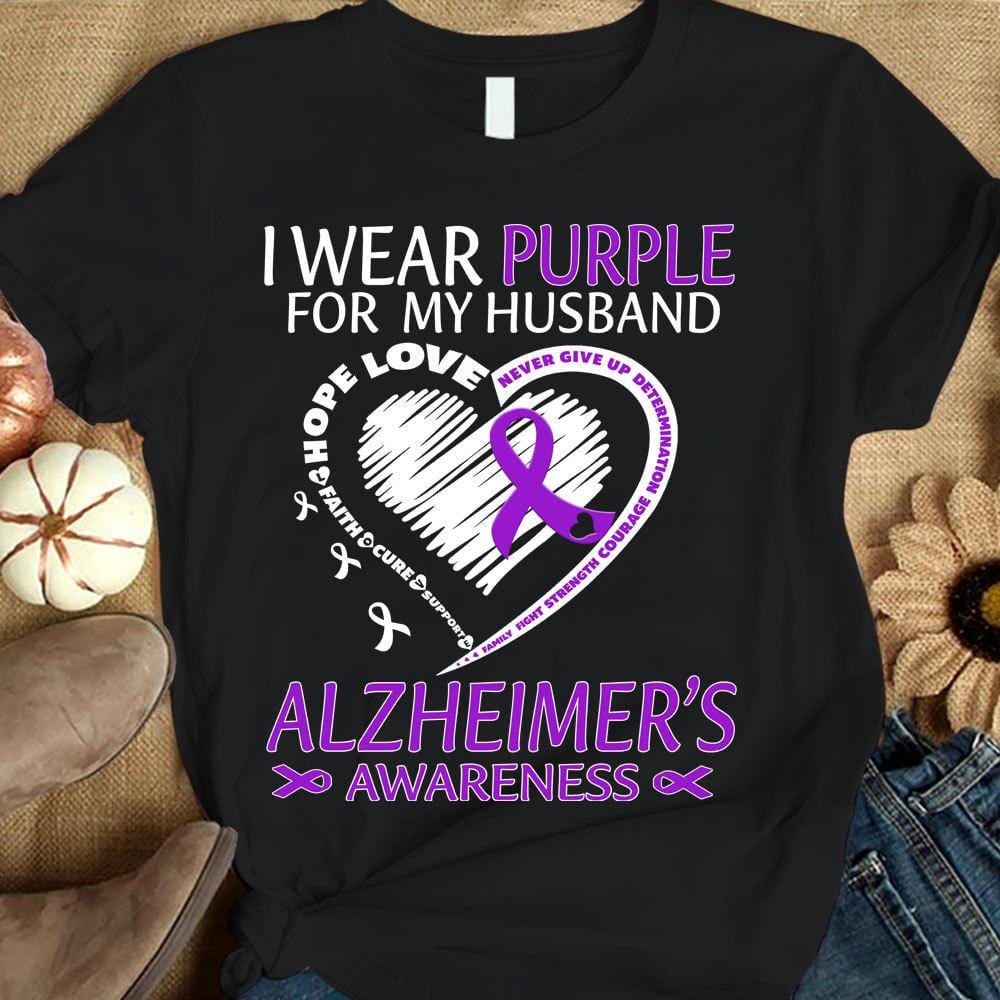 Llevo morado por mi marido, corazón de lazo, camiseta de concienciación sobre el Alzheimer