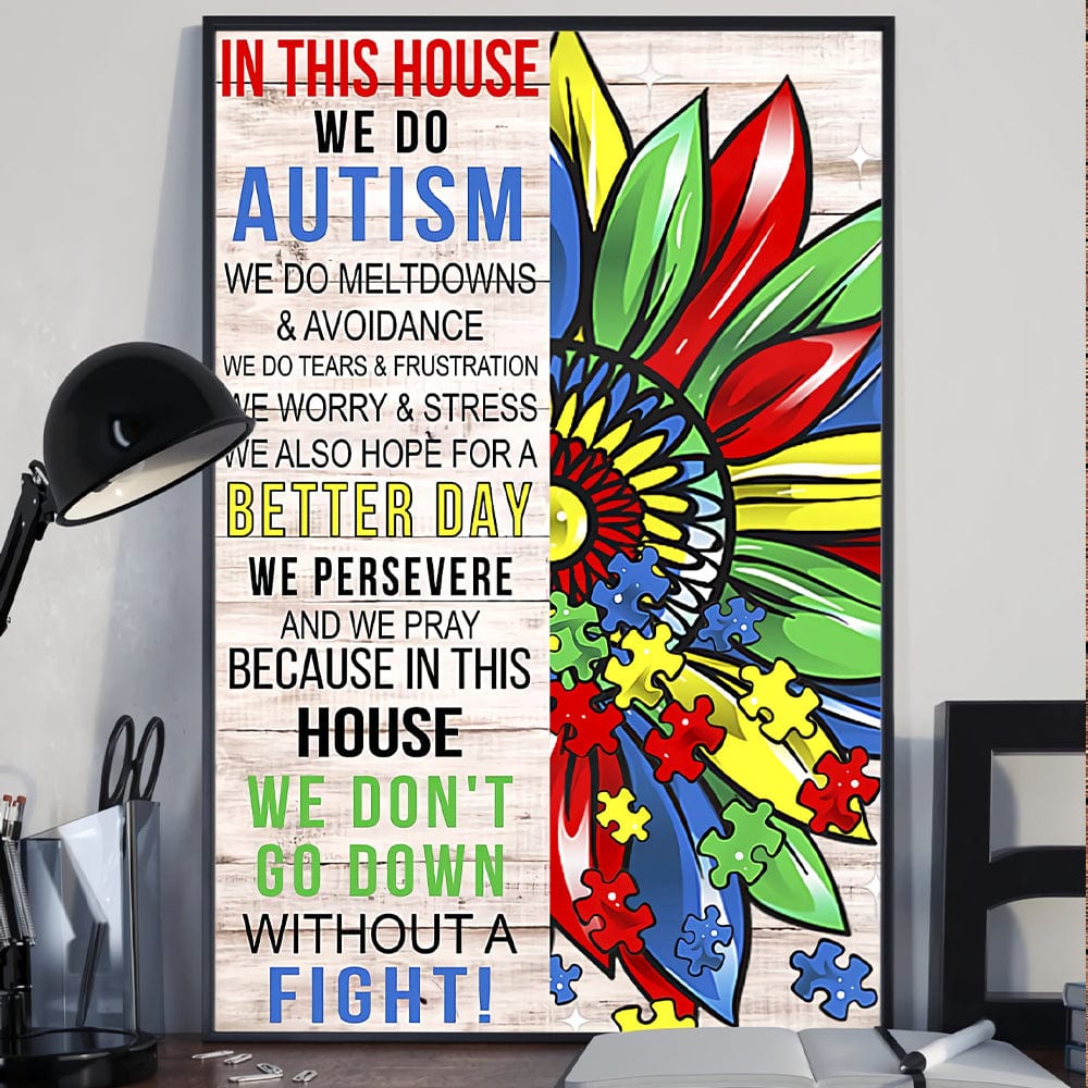 En esta casa trabajamos para concienciar sobre el autismo, póster en lienzo con girasol