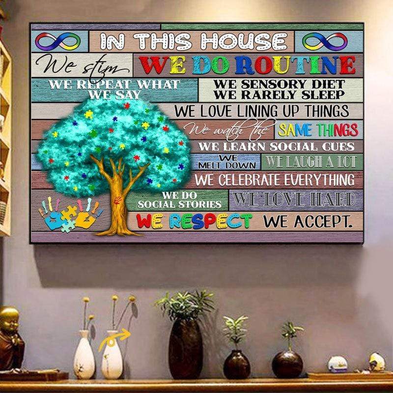En esta casa hacemos rutinas de dieta sensorial, divertido árbol de piezas de rompecabezas, póster de concienciación sobre el autismo, lienzo, arte de impresión de pared