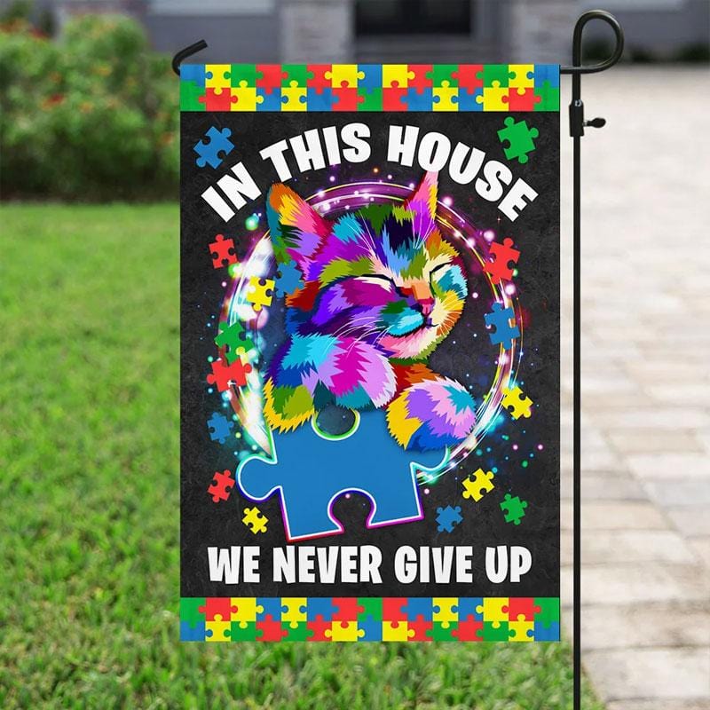 En esta casa nunca nos rendimos, pieza de rompecabezas de gato, bandera de concienciación sobre el autismo, bandera para casa y jardín