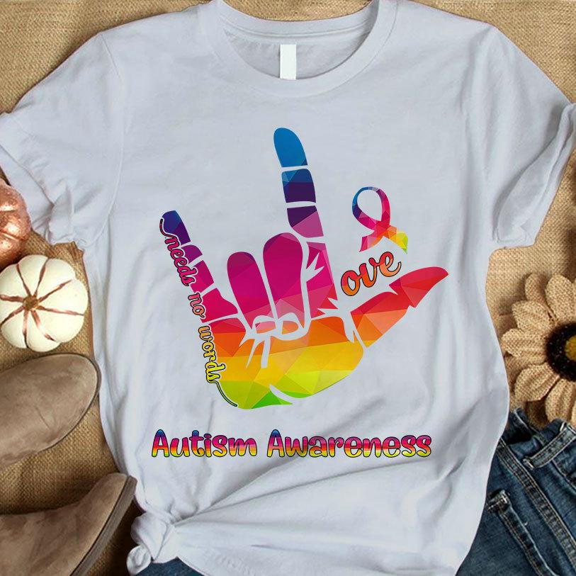 Camiseta de concienciación sobre el autismo con lazo en la mano y el amor no necesita palabras