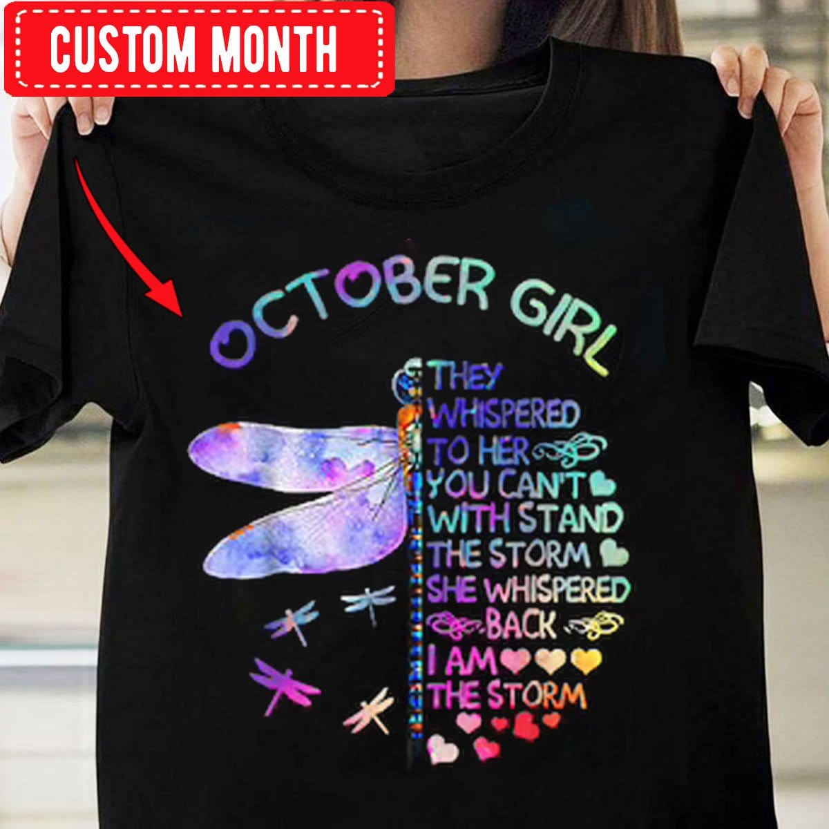Chica de octubre, ella susurró: "Soy la tormenta", camisetas de cumpleaños personalizadas con libélula