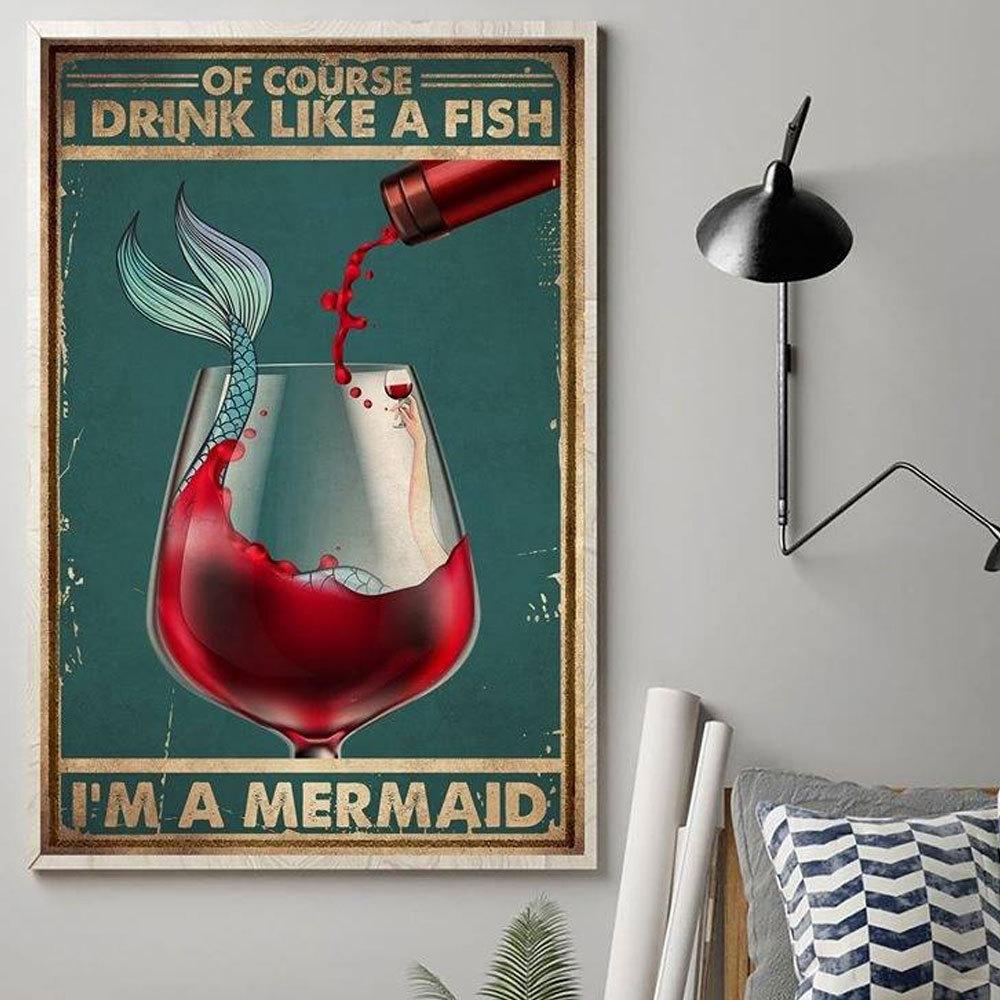 Por supuesto que bebo como un pez, soy una sirena, póster de vino, lienzo