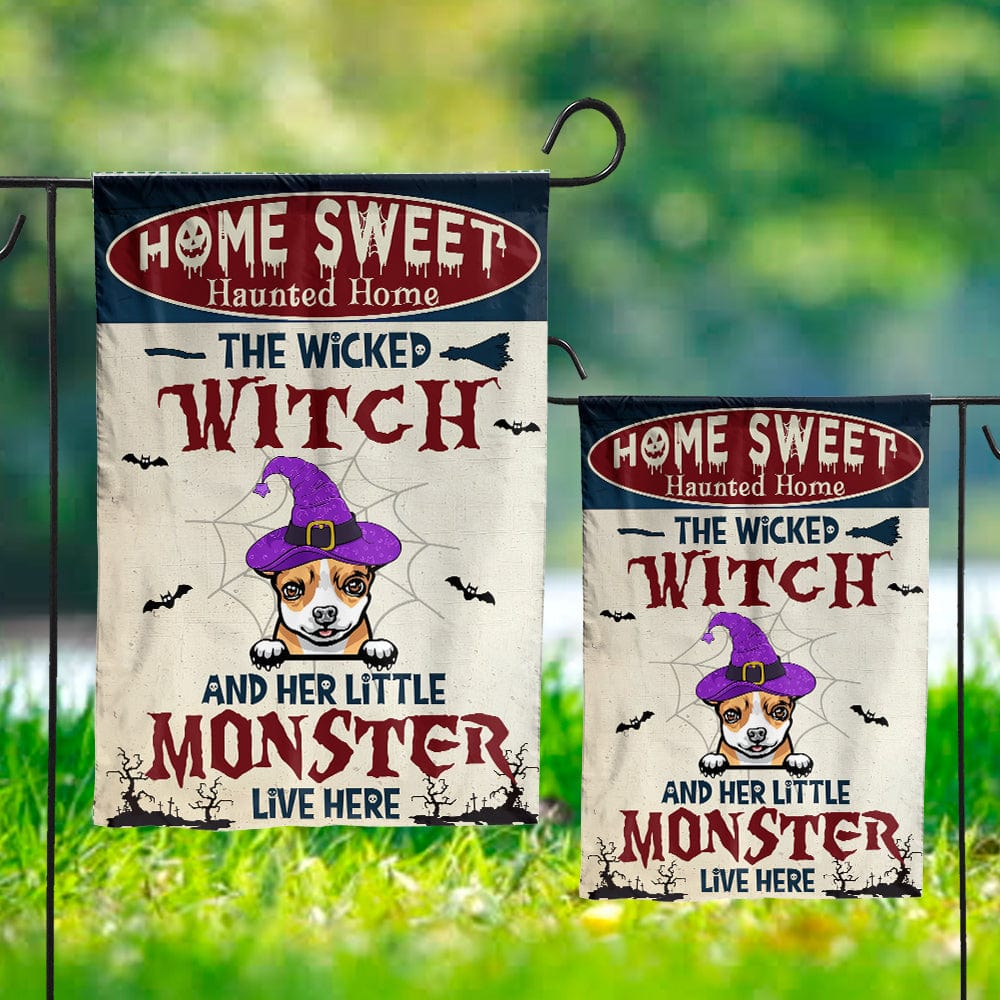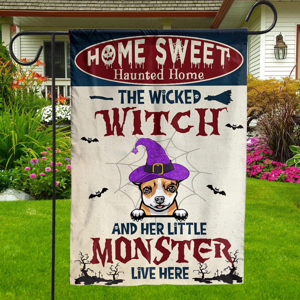 Casa para perro y bandera de jardín personalizadas, Hogar, dulce hogar embrujado, La bruja malvada y su pequeño chihuahua monstruo viven aquí