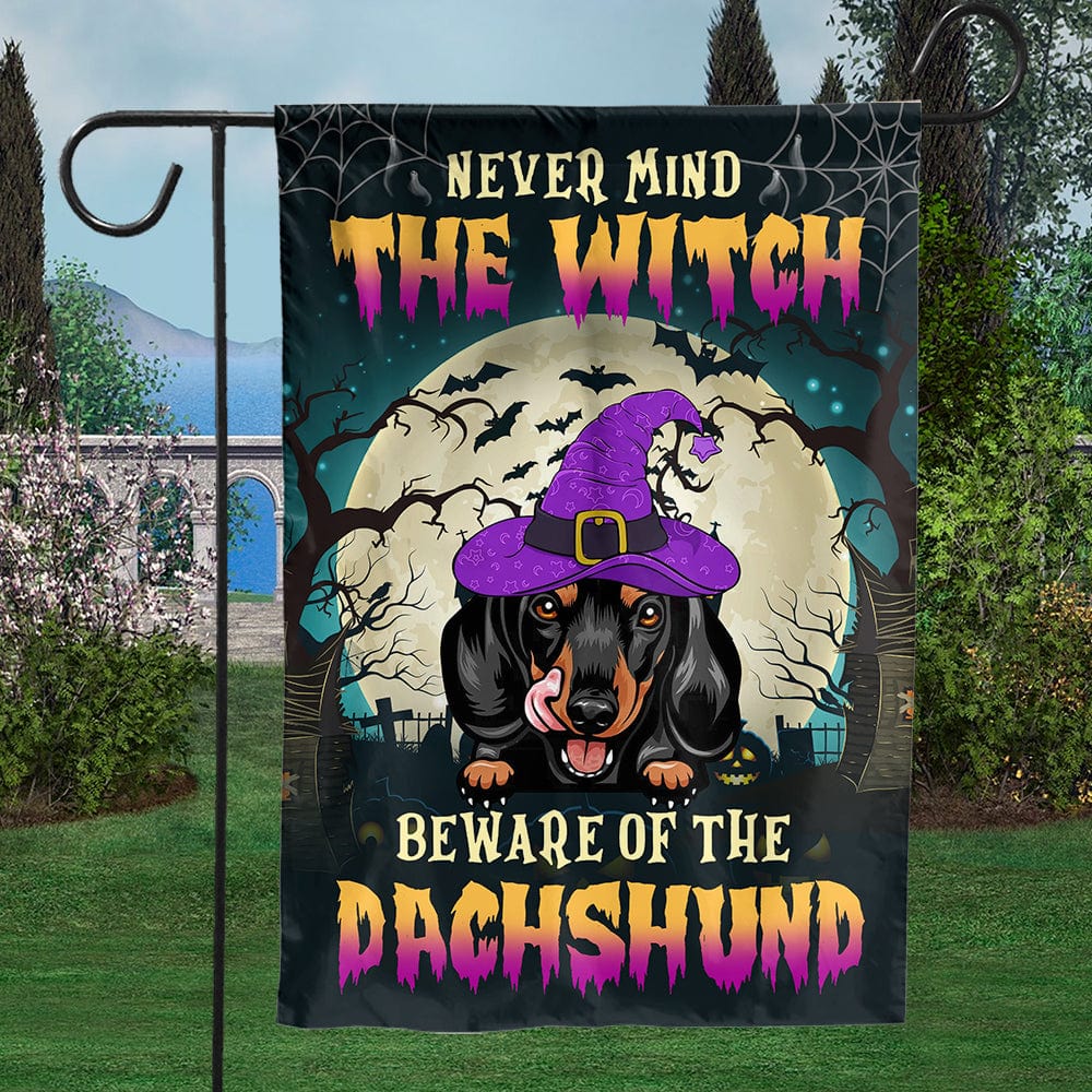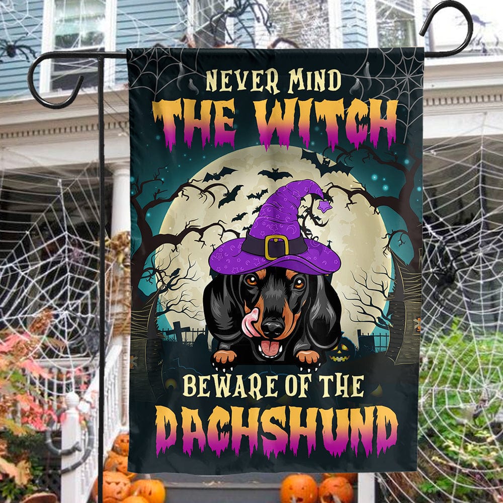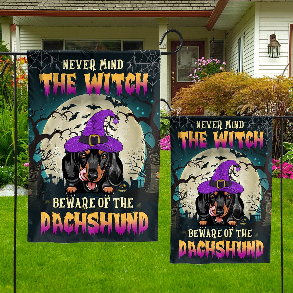 Bandera personalizada para casa y jardín con diseño de perro salchicha. No te preocupes por la bruja, ten cuidado con el perro salchicha