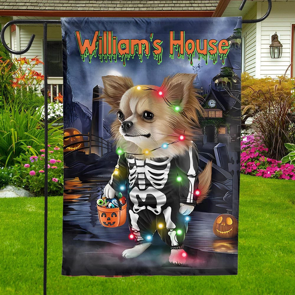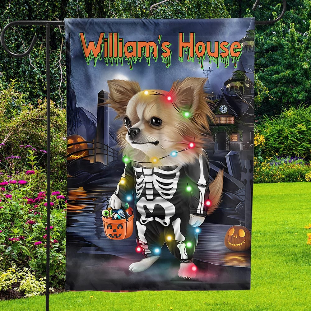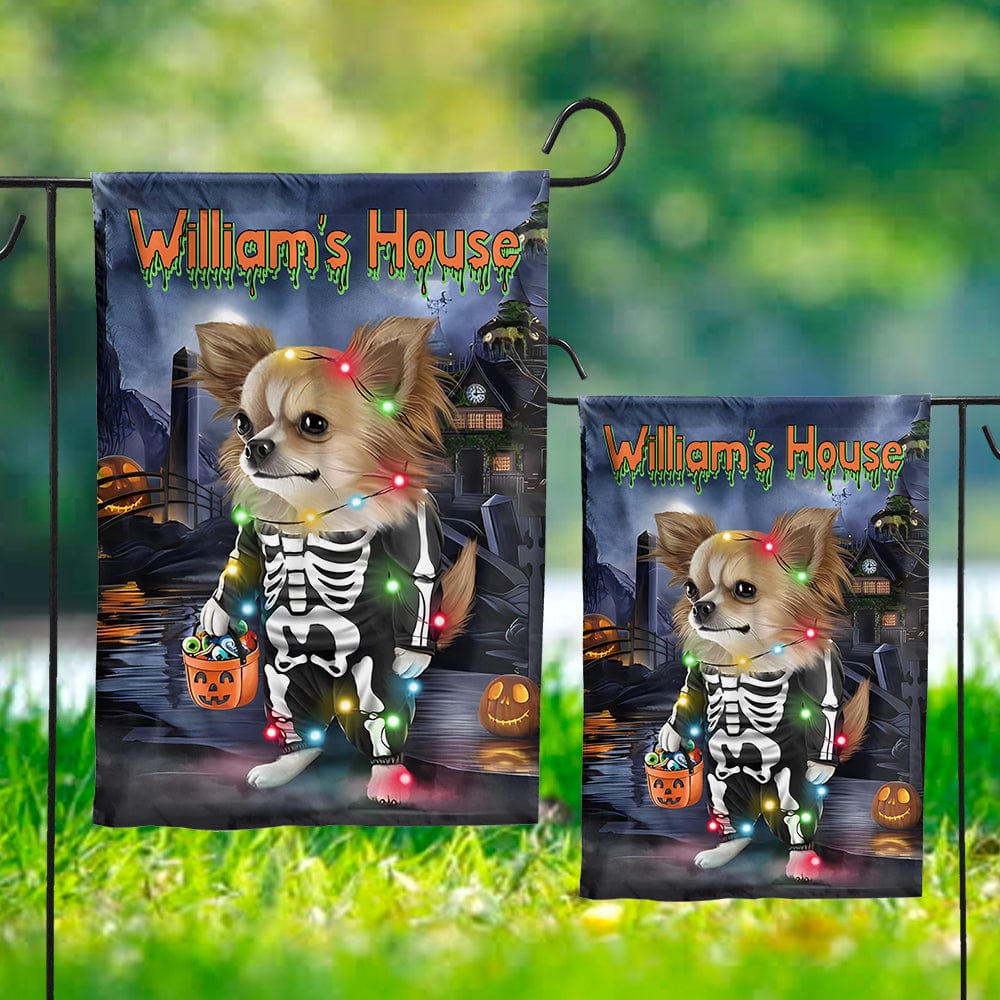 Bandera personalizada para casa y jardín de chihuahua: la casa encantada y tu chihuahua para la temporada de Halloween