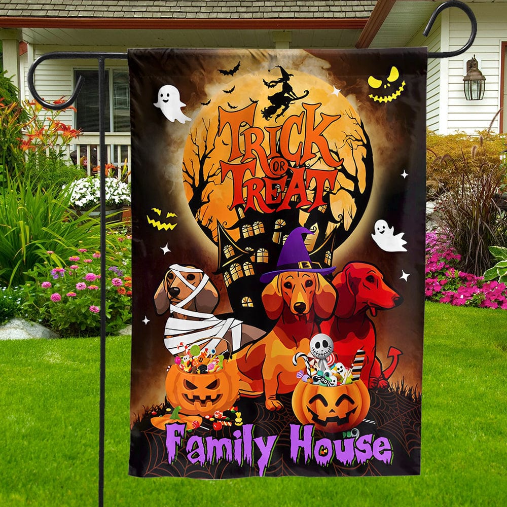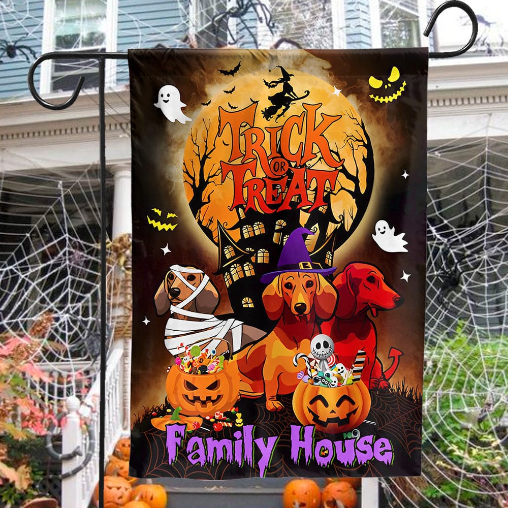 Bandera personalizada para casa y jardín con forma de perro salchicha, truco o trato con la familia