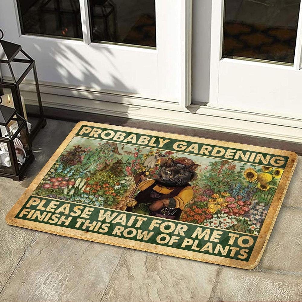 Probablemente haciendo jardinería con un felpudo de gato negro