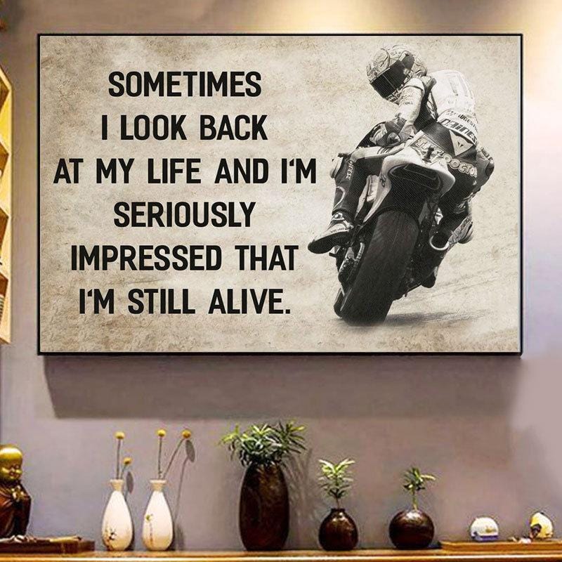 A veces miro hacia atrás en mi vida y me sorprende mucho que todavía esté vivo. Póster de motocicleta, lienzo