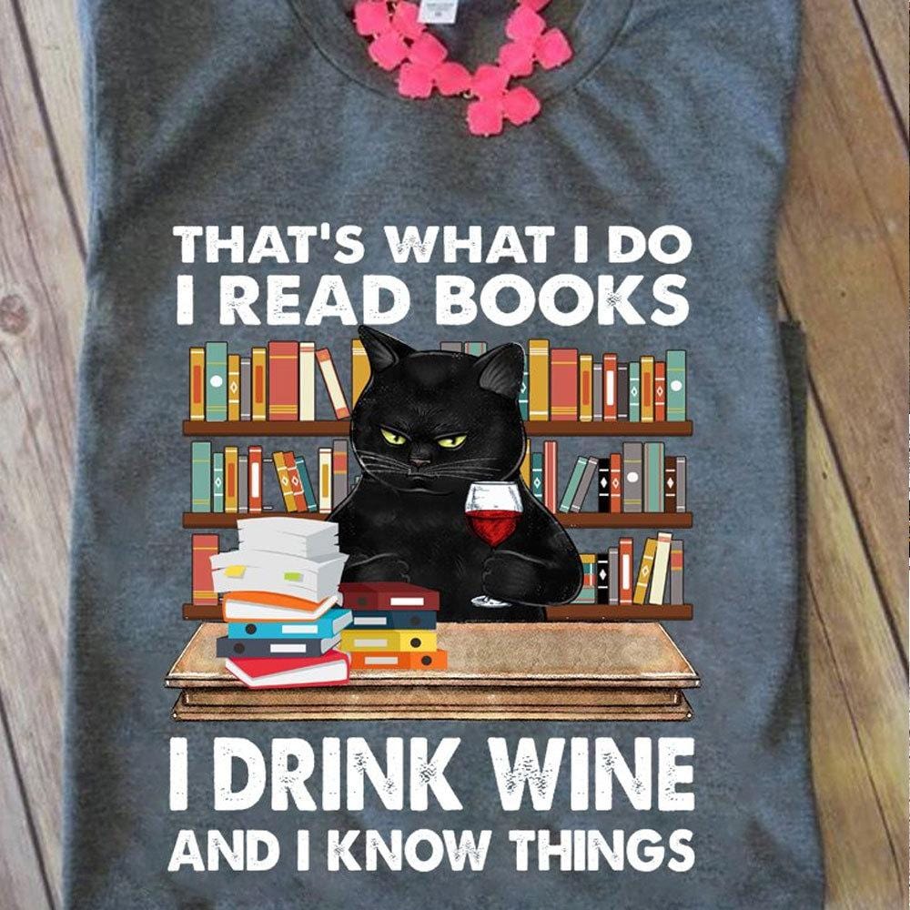 Eso es lo que hago. Leo libros, bebo vino y sé cosas. Camisetas de vino para gatos.