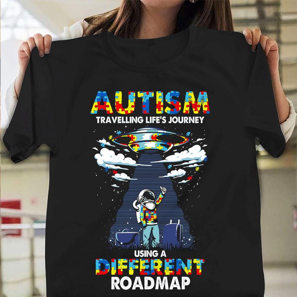 Viajando por el camino de la vida usando un mapa de ruta diferente, astronauta con piezas de rompecabezas, camiseta de concienciación sobre el autismo