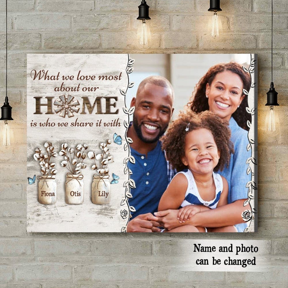 Lo que más nos gusta de nuestro hogar es con quién lo compartimos Póster familiar personalizado, lienzo
