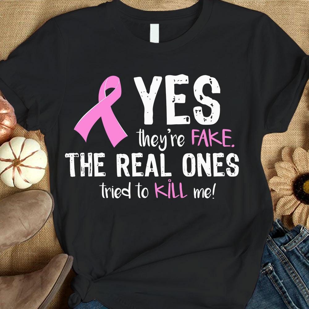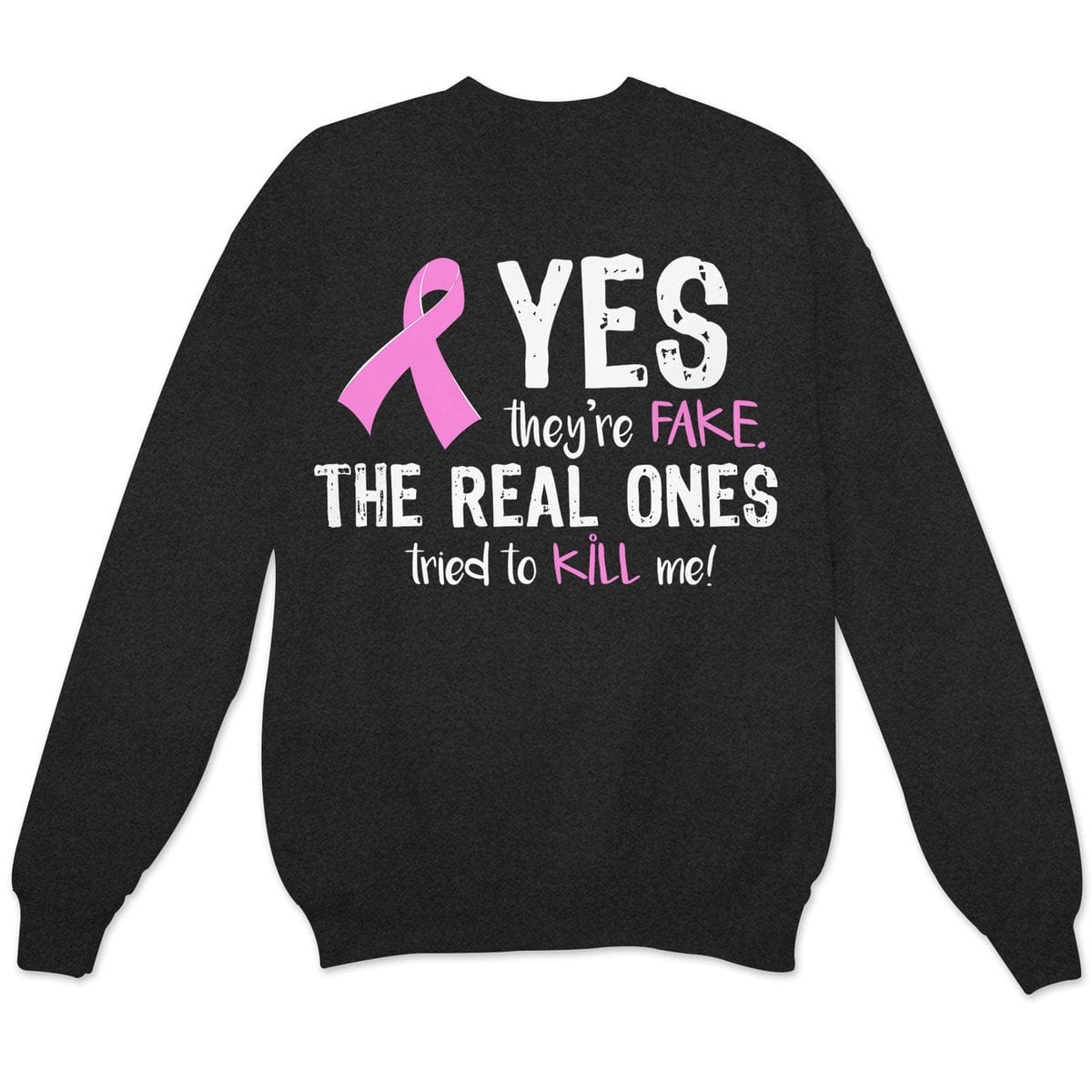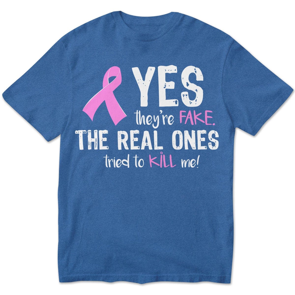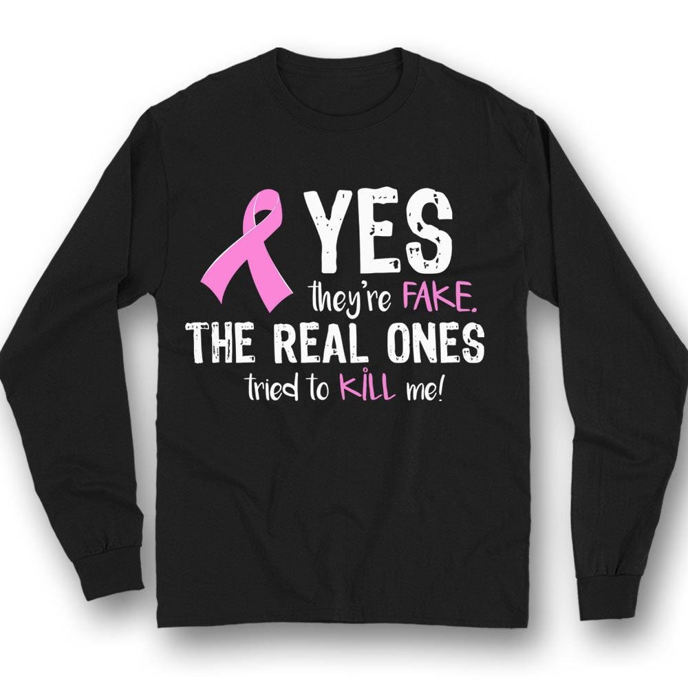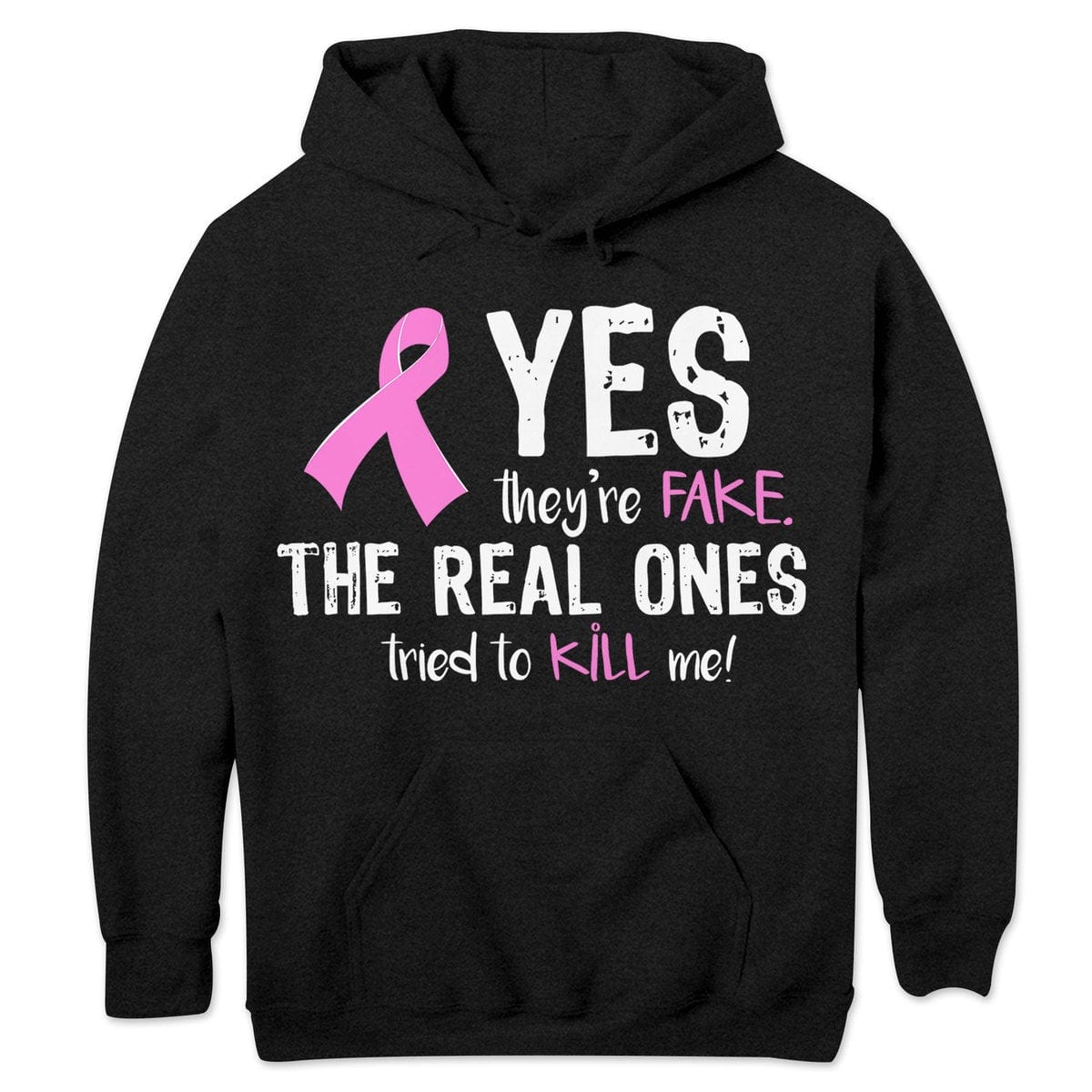 Sí, son falsos. Los verdaderos intentaron matarme. Sudadera con capucha y camisetas contra el cáncer de mama.