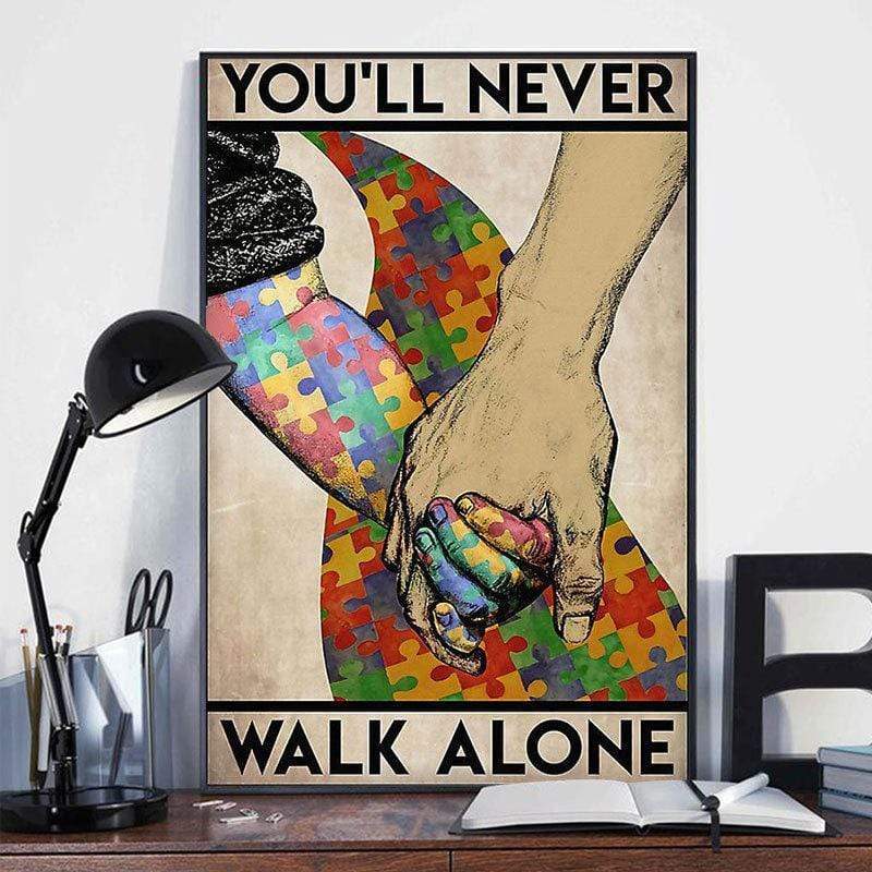 Nunca caminarás solo, pieza de rompecabezas en forma de mano, póster de concienciación sobre el autismo, lienzo, arte de impresión de pared, decoración del hogar