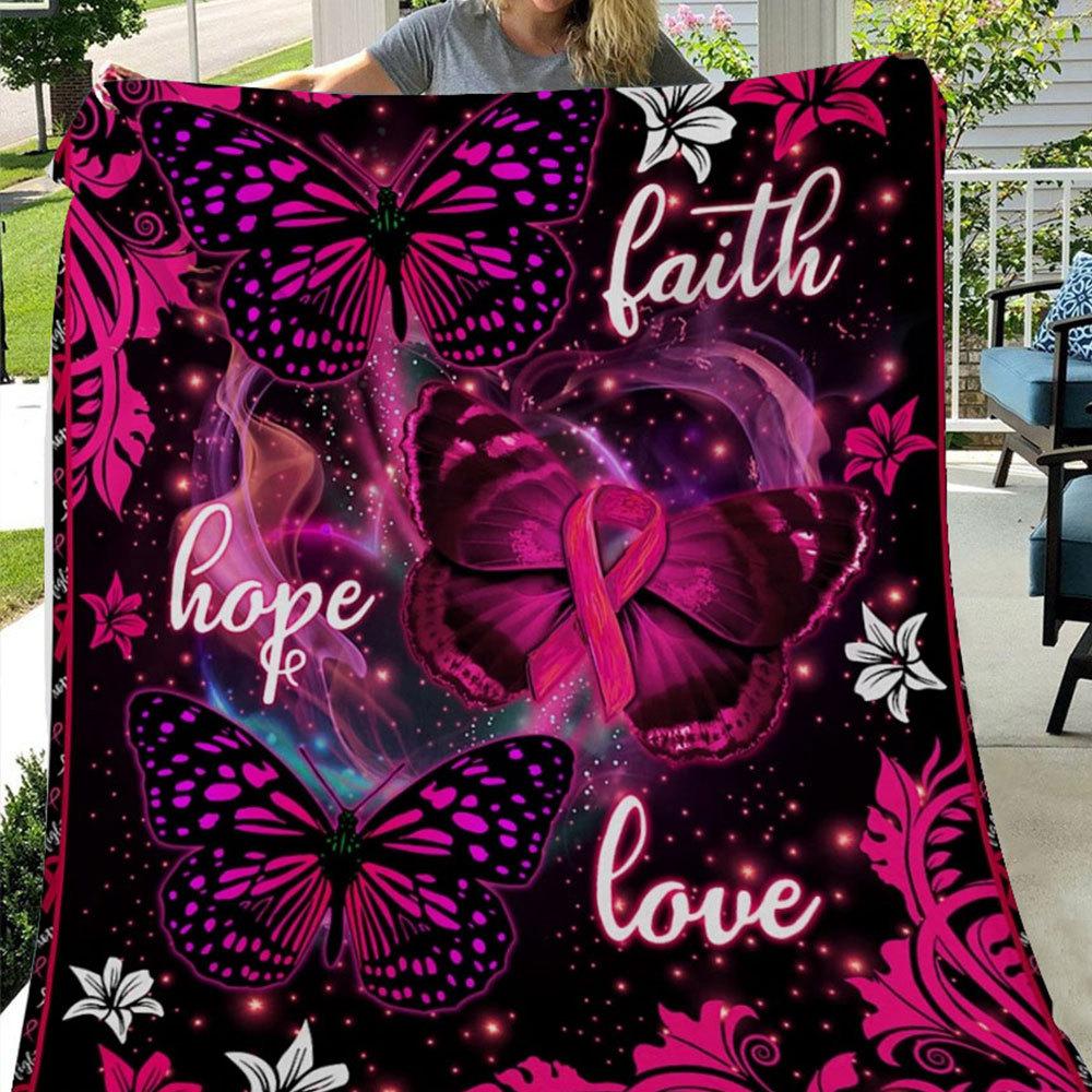 Faith Hope Love With Pink Ribbon And Butterfly, Breast Cancer Fleece & Sherpa Blanket