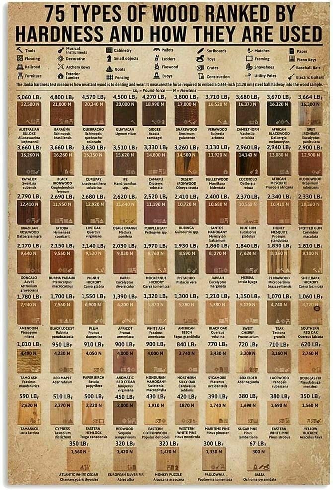 75 Types Of Wood Ranked By Hardness And How They Are Used Guide Carpenter Knowledge Poster, Canvas