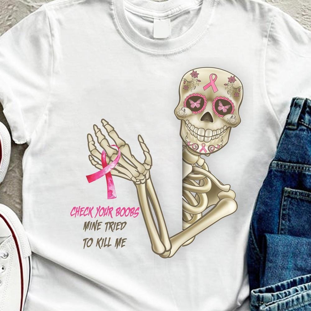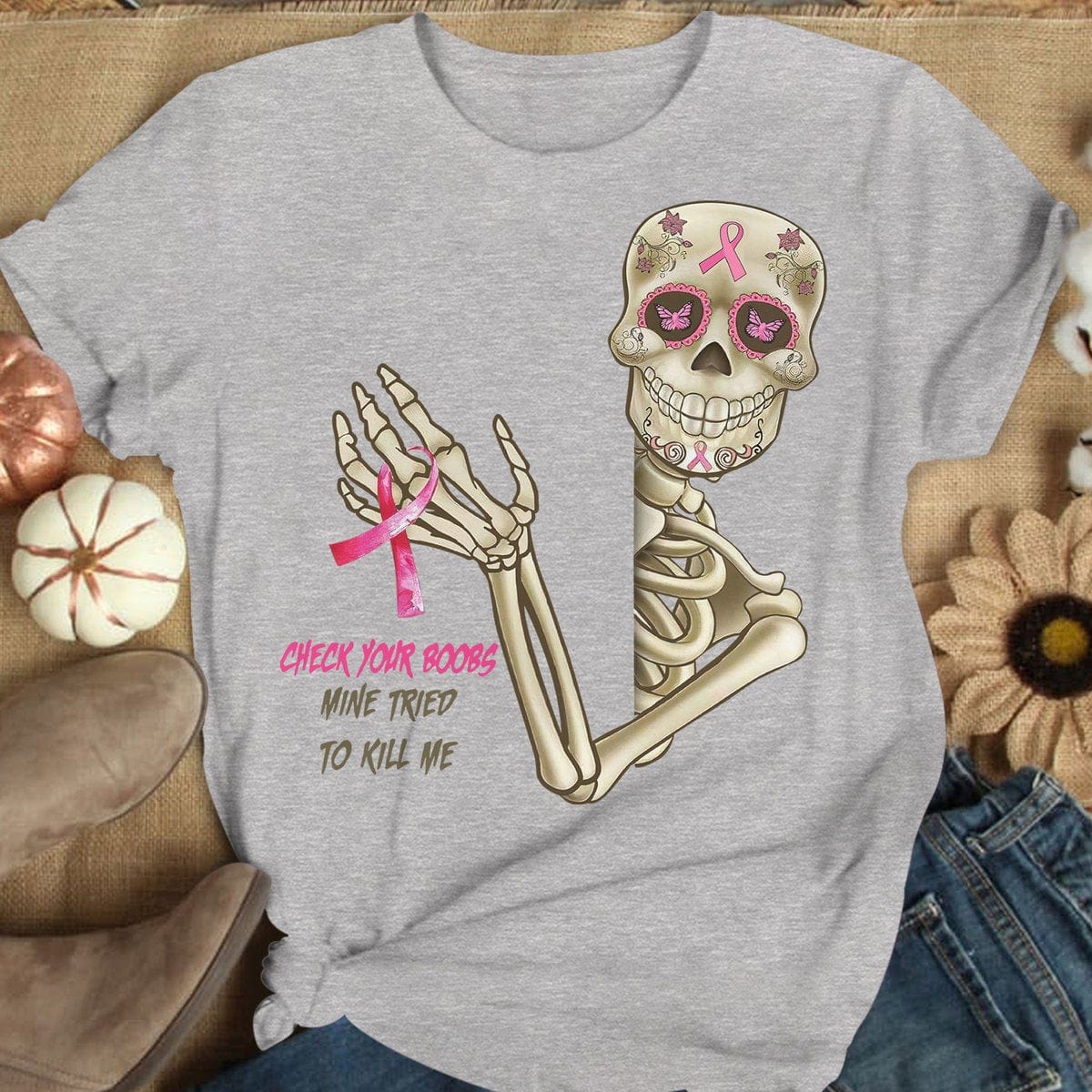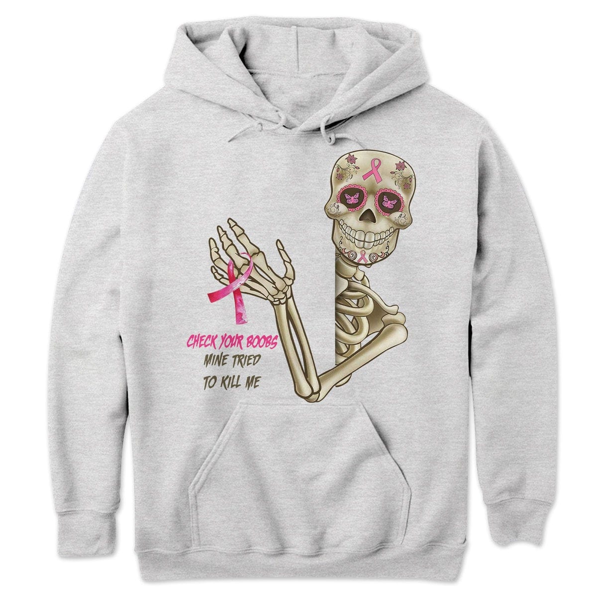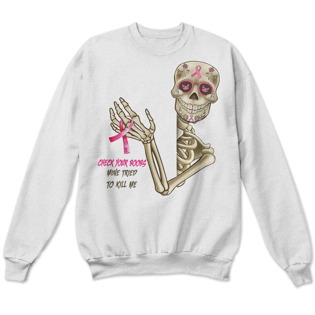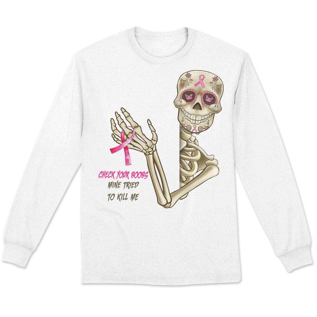 Check Your B00bs Mine Tried To Kill Me, Skeleton Breast Cancer Long Sleeve Shirts