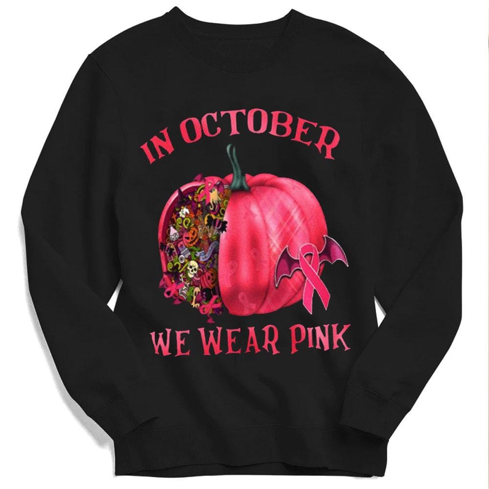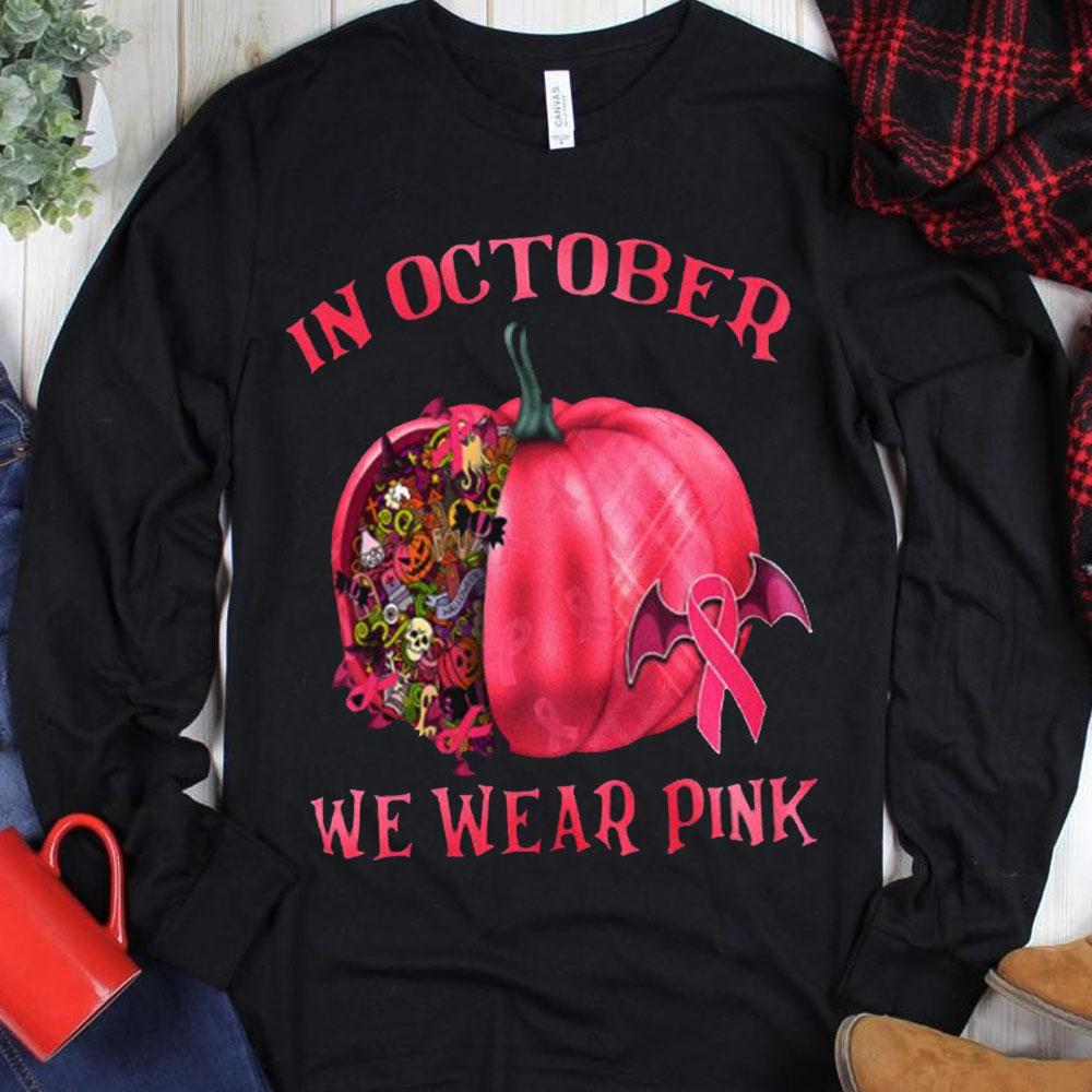 In October We Wear Pink With Pumpkin, Halloween Breast Cancer Hoodie, Shirt