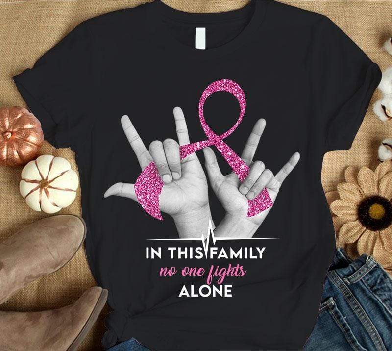 In This Family No One Fights Alone, Hand And Ribbon, Breast Cancer Survivor Awareness Shirt