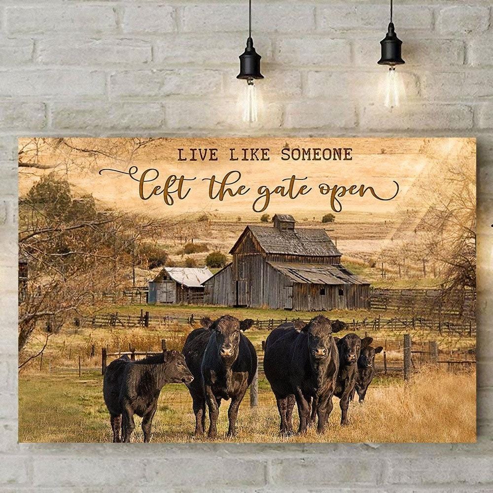 Live Like Someone Left The Gate Open, Black Angus Cow Poster, Canvas