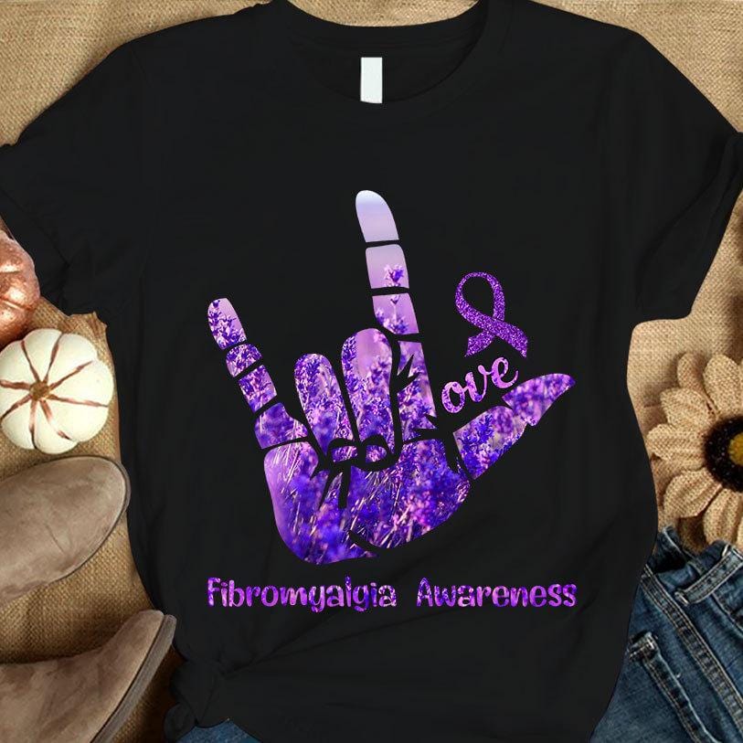 Love, Purple Ribbon Hand, Fibromyalgia Awareness T Shirt Humor