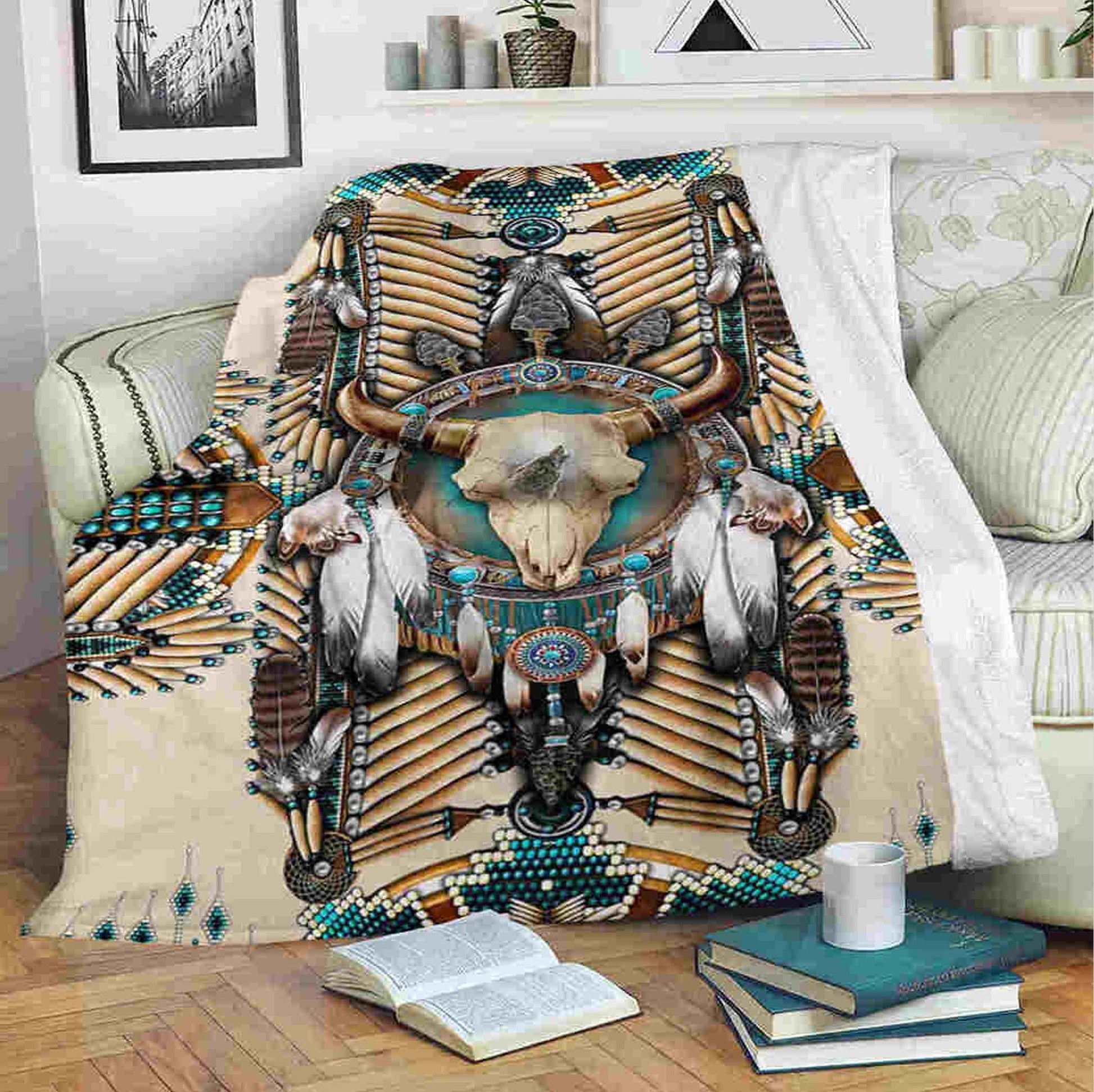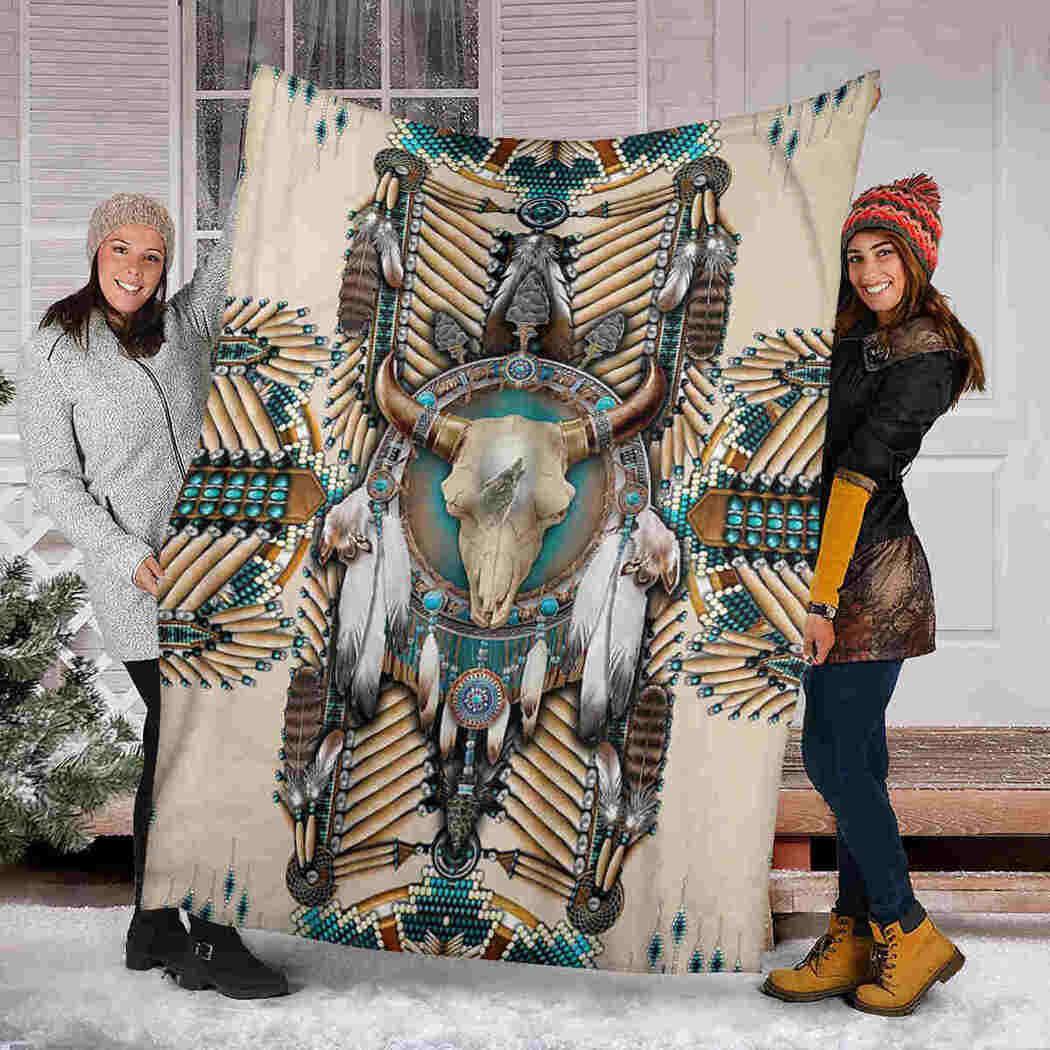 Native American Buffalo Skull Feather Fleece & Sherpa Blanket