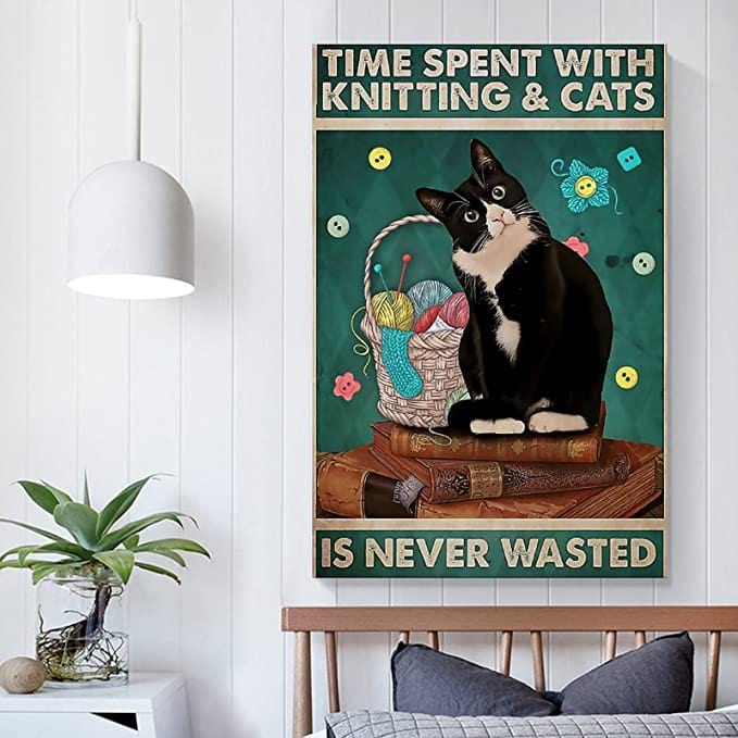 Time Spent With Knitting And Cats Is Never Wasted Black Cat Poster, Canvas