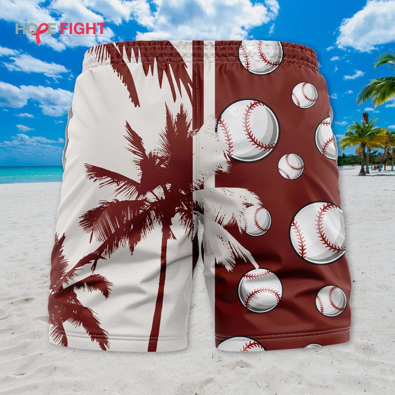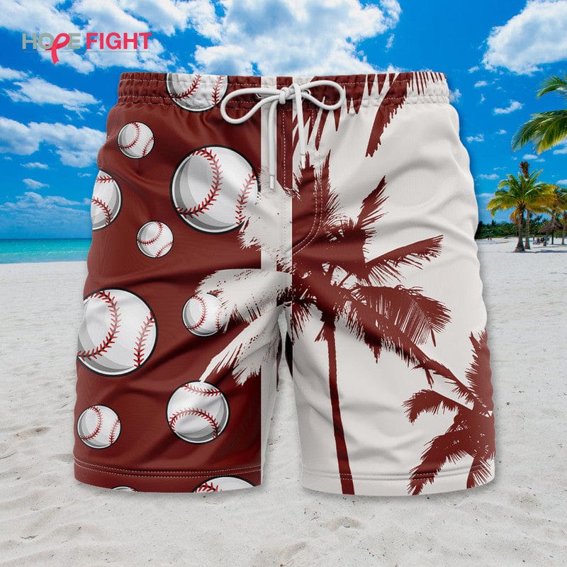 Tropical Baseball Swim Trunks, Vintage Ball & Palm Tree Print, Sporty Summer